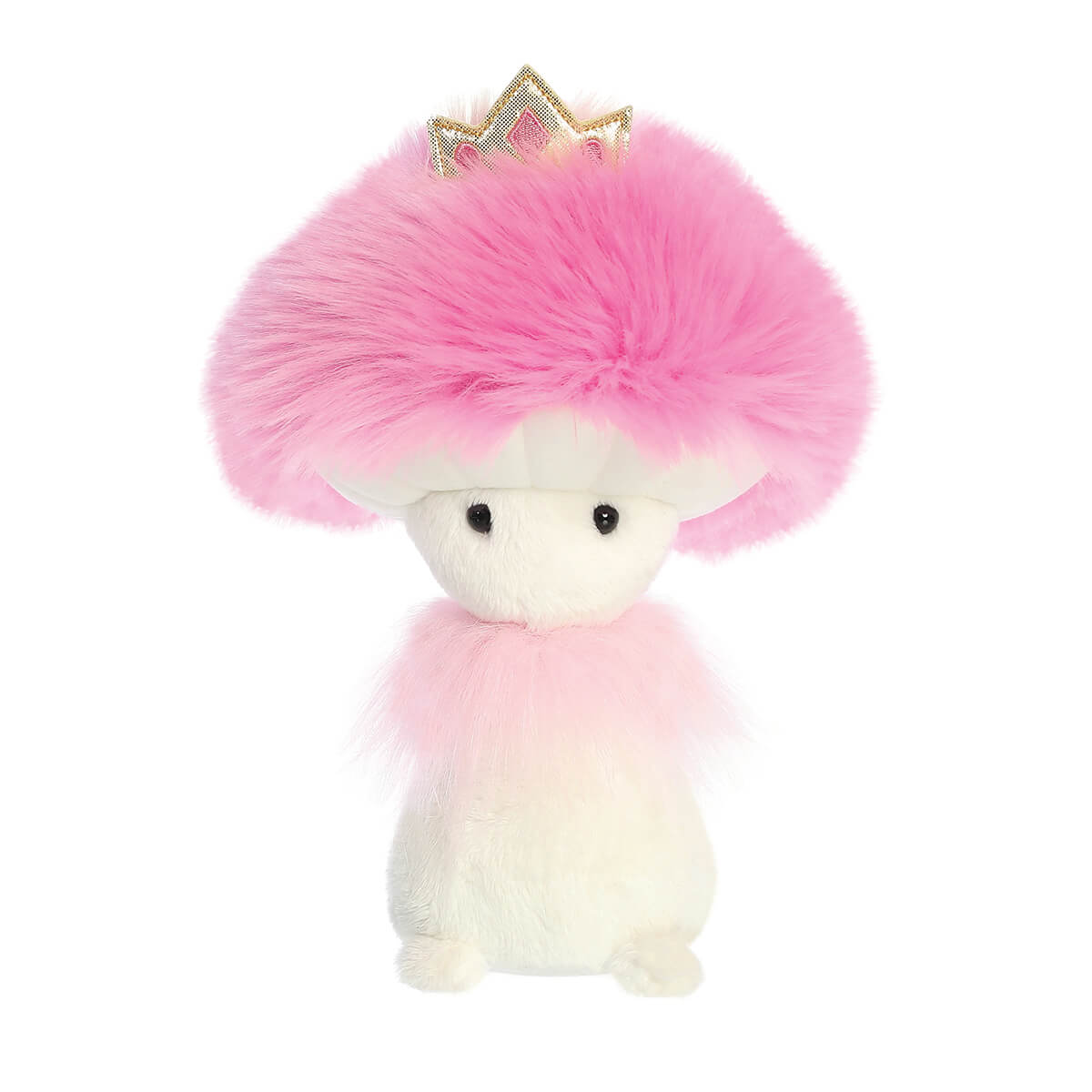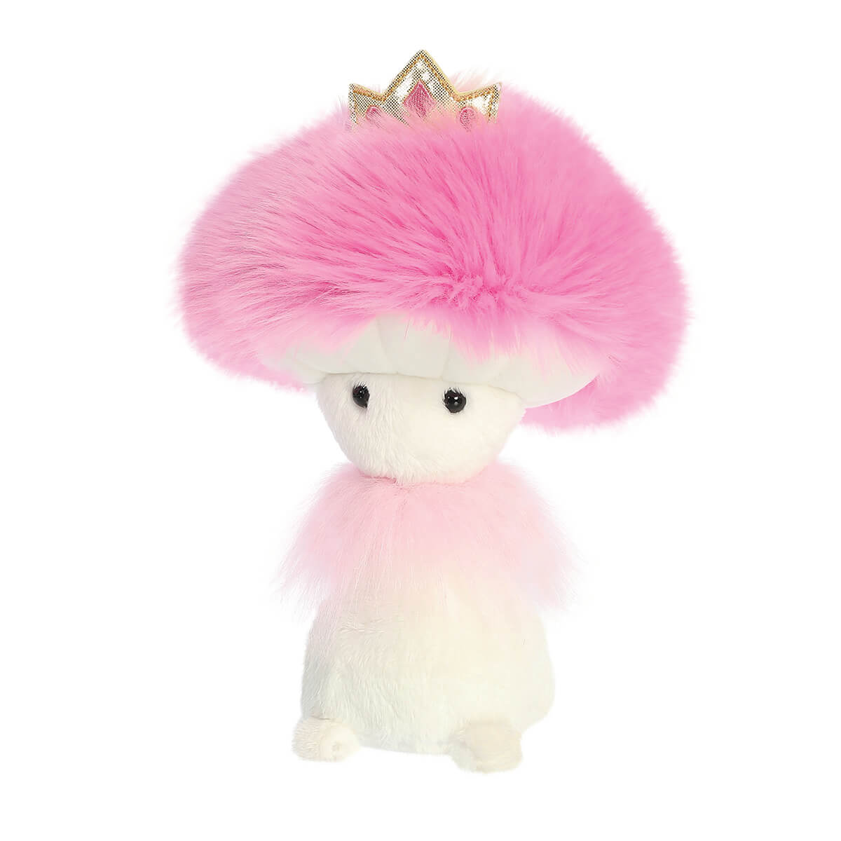 Princess Fungi Friends Soft Toy by Aurora. This enchanting mushroom is part of the magical Sparkle Tales Fungi Friends collection by Aurora. Made from a super soft plush, and topped off with a fluffy pink mushroom cap. She has sweet little eyes with a charming expression, a fluffy ring, and cute little feet to stand on, as well as a golden princess crown on the top which makes her irresistibly cute. Filled with eco-friendly recycled inner fibre and beans made from recycled plastic materials.