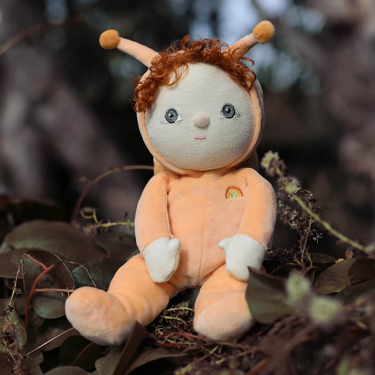Scottie Snail Dinky Dinkum by Olli Ella. Scottie Snail is the slow-but-snuggly friend who never rushes, because why would you when you’ve got all the time in the world for cuddles? Big on naps, bigger on hugs, Scottie brings a sense of calm, whether it’s inching along or curled up for a cozy rest. In a soft, velvety orange jumpsuit with matching hood and antennae, Scottie is the epitome of warmth and comfort. Rich, fiery orange curls and ashy hazel eyes are a soft contrast to the big, swirling snail shell on his back, which boasts a delightful yellow embroidery. With a gentle presence and laid-back style, Scottie is the perfect companion for little ones who love to slow down, snuggle, and enjoy the quiet moments.