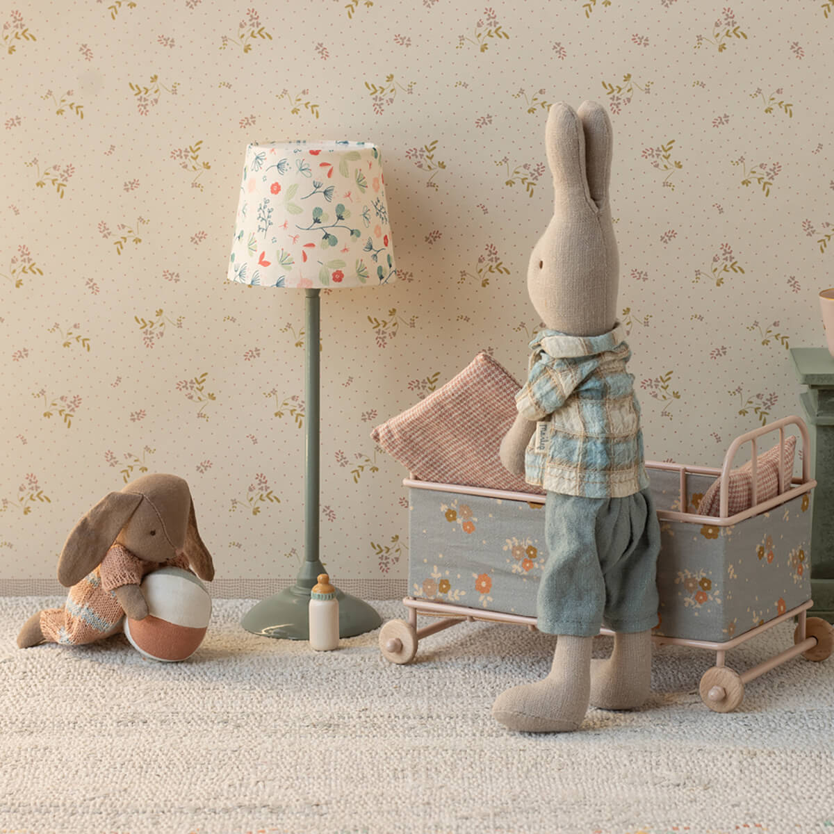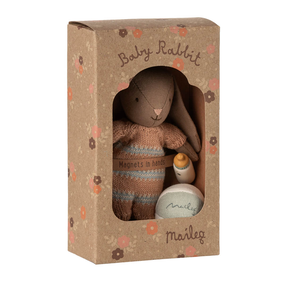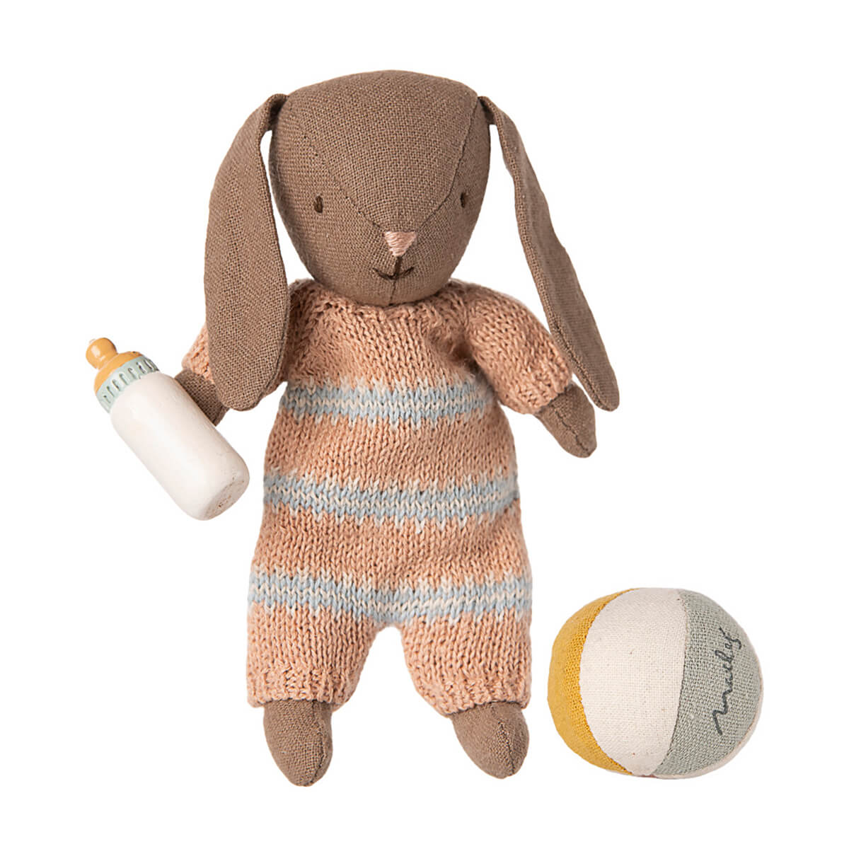 Micro bunny set by Maileg. The perfect gift set to start hours of storytelling. It contains a small ball, a soft bunny in size micro with magnets in hands to hold the baby bottle. All fitted nicely together and a great start of any bunny collection.