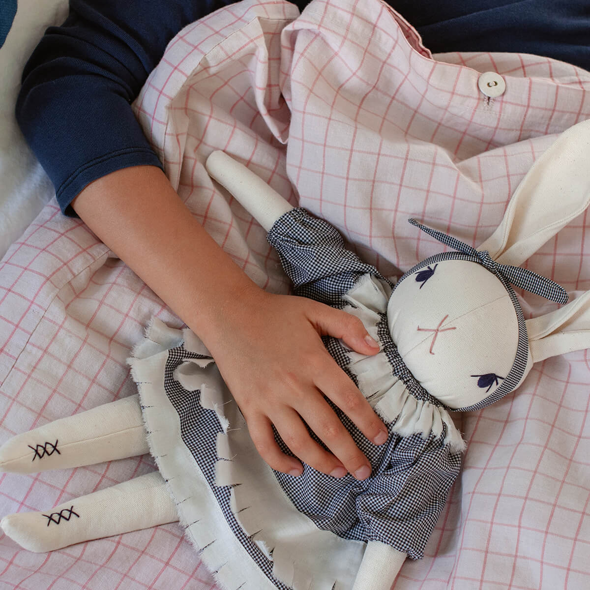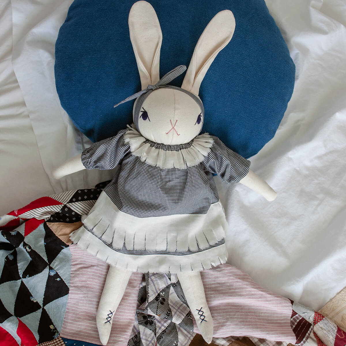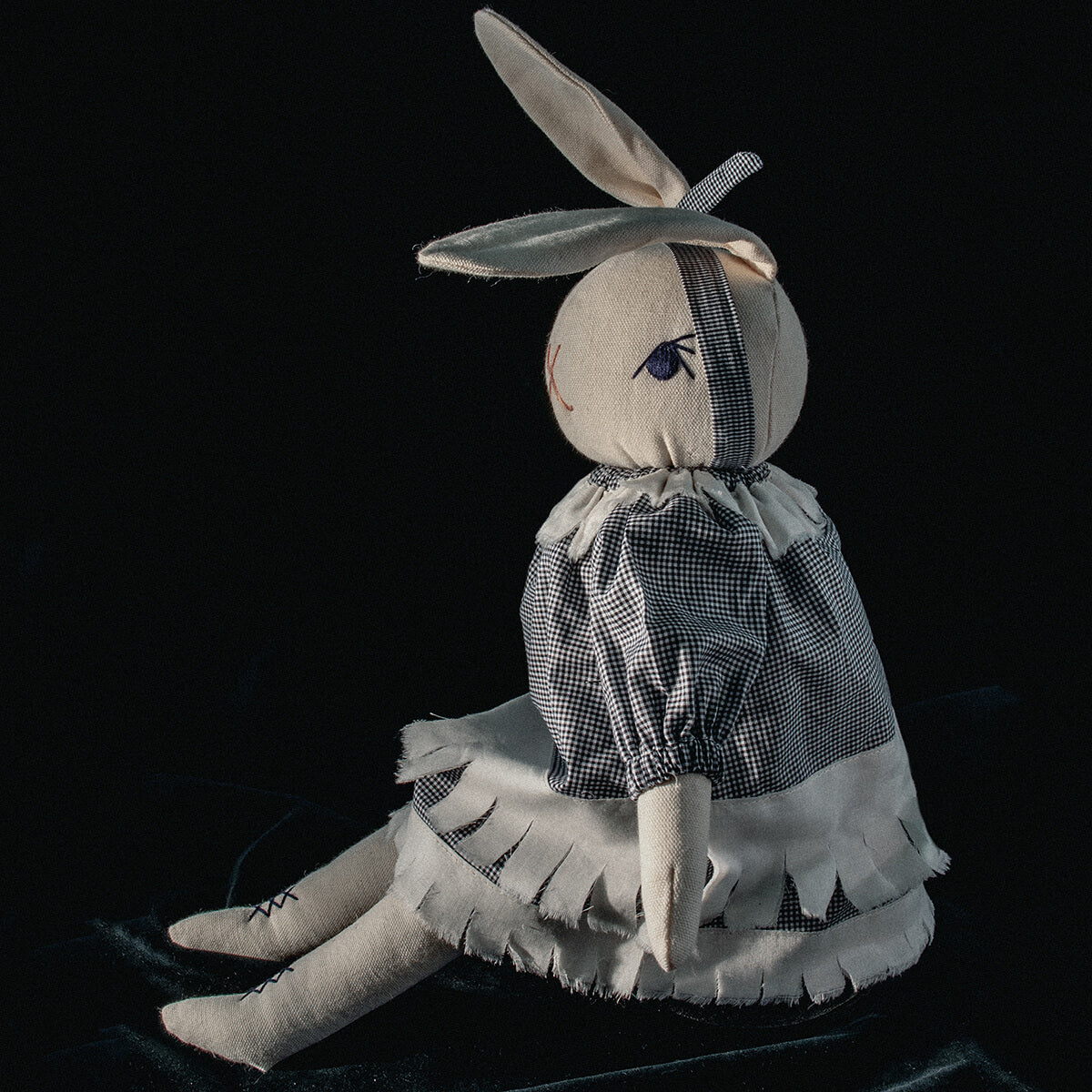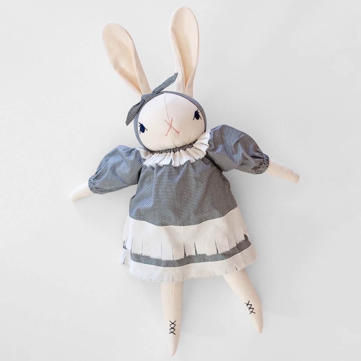 Claire large rabbit by Polka Dot Club. Claire is made from 100% cotton canvas with a hand-embroidered face and ankles. She has a disc-jointed neck and floppy limbs. She is wearing a black and white checked cotton dress and a cotton headband.