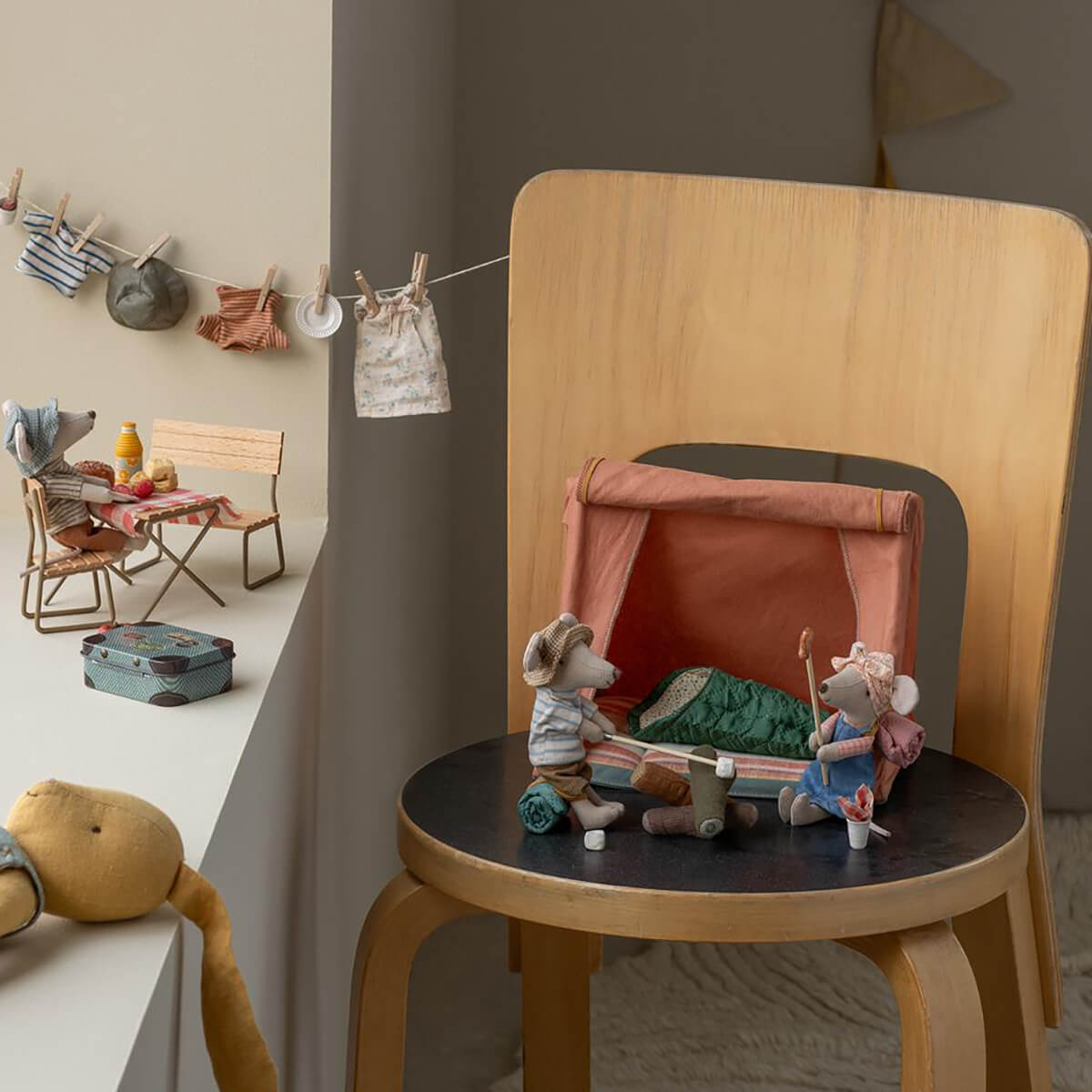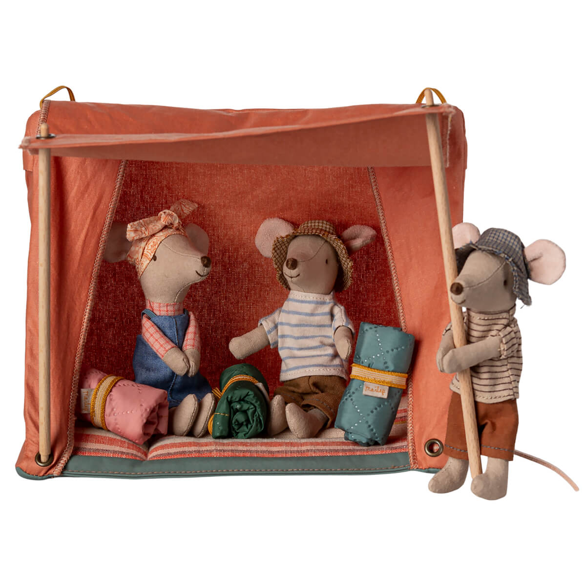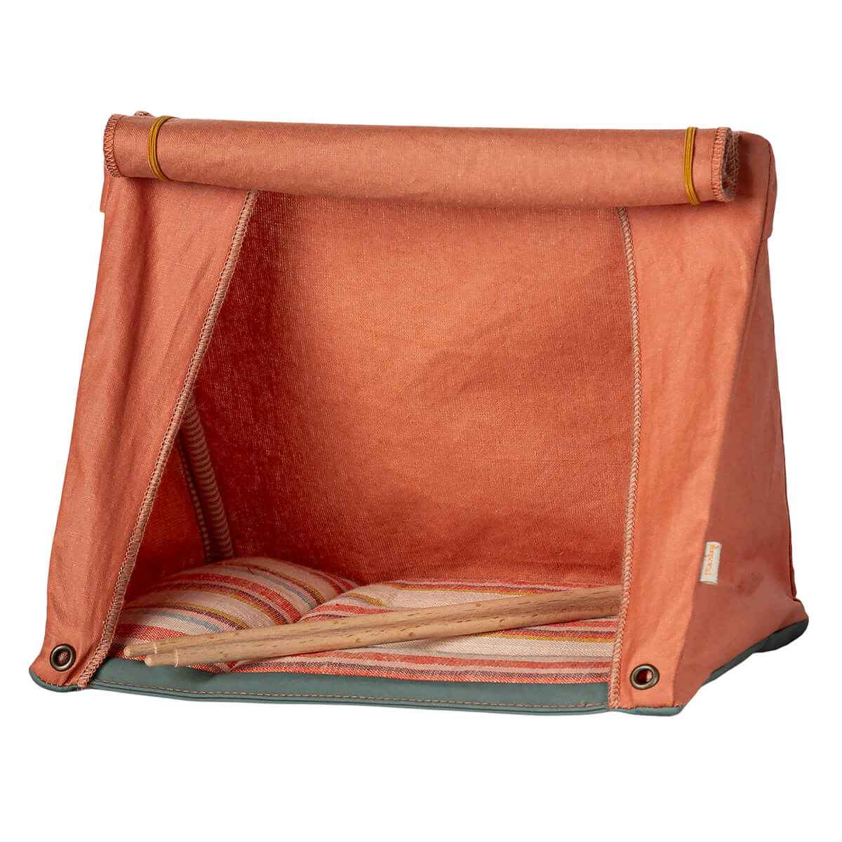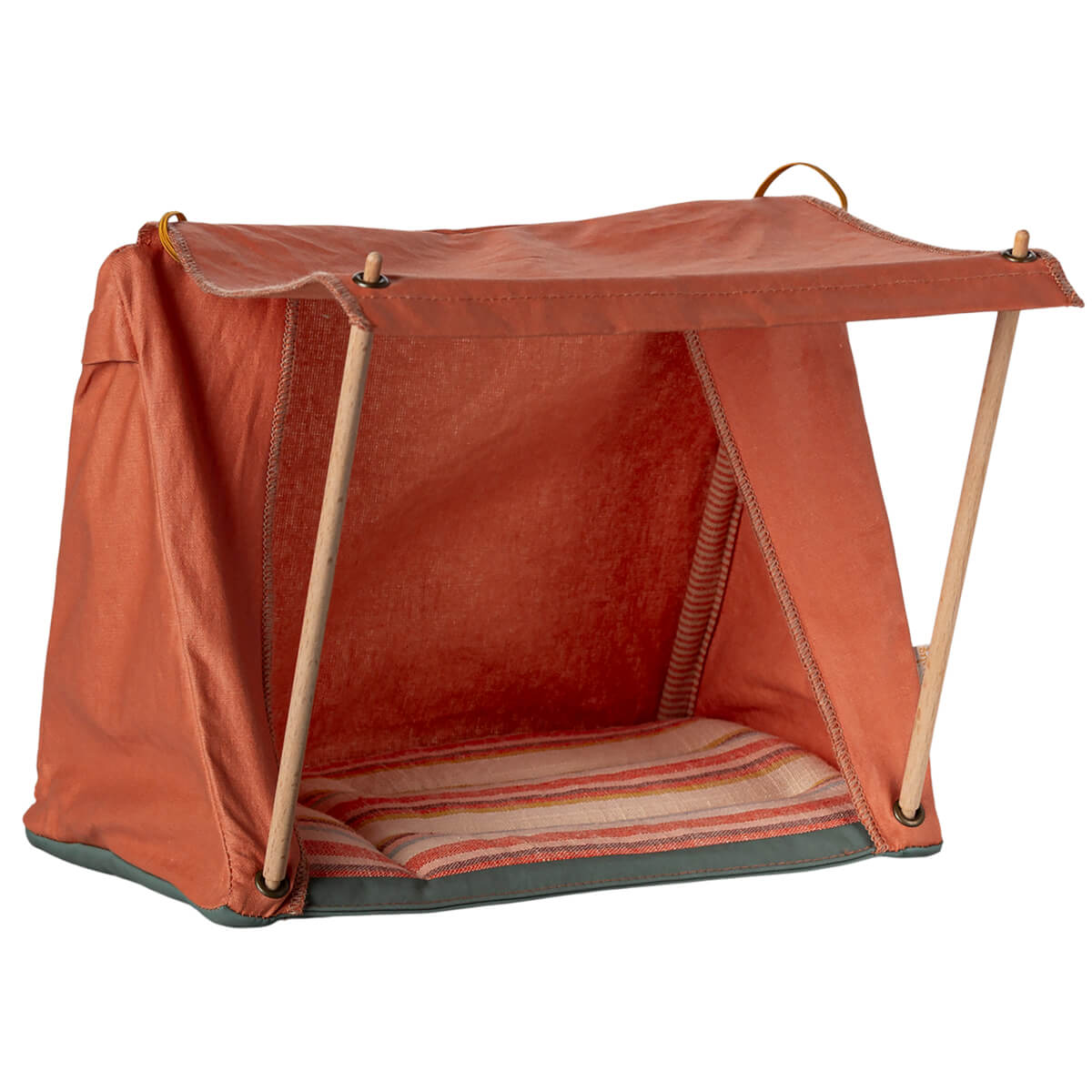 Happy Camper Tent in orange with striped blanket by Maileg. Take your mice for a sleepover in the fold-up tent. The wooden sticks can hold the tent door up and give shelter from the rain. The outer fabric has a coated surface for a more authentic look. Remember to ask them to bring their sleeping bags.