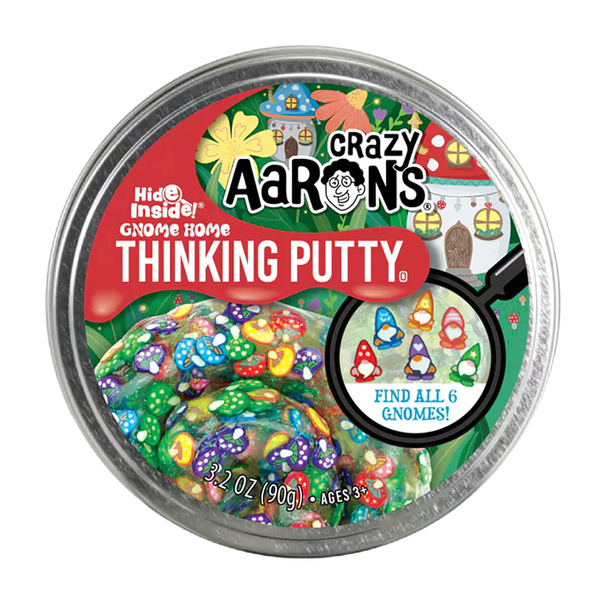 Hide Inside Gnome Home Thinking Putty by Crazy Aarons. Gnome Home Thinking Putty is where the heart is! How quickly can you forage through the cluster of colorful mushrooms to find the 6 hidden gnomes? If you look close enough you'll always find what you are looking for. This firm putty has a clear base with with small clay pieces inside. Stretch it, bounce it, pop it, tear it, and sculpt it!