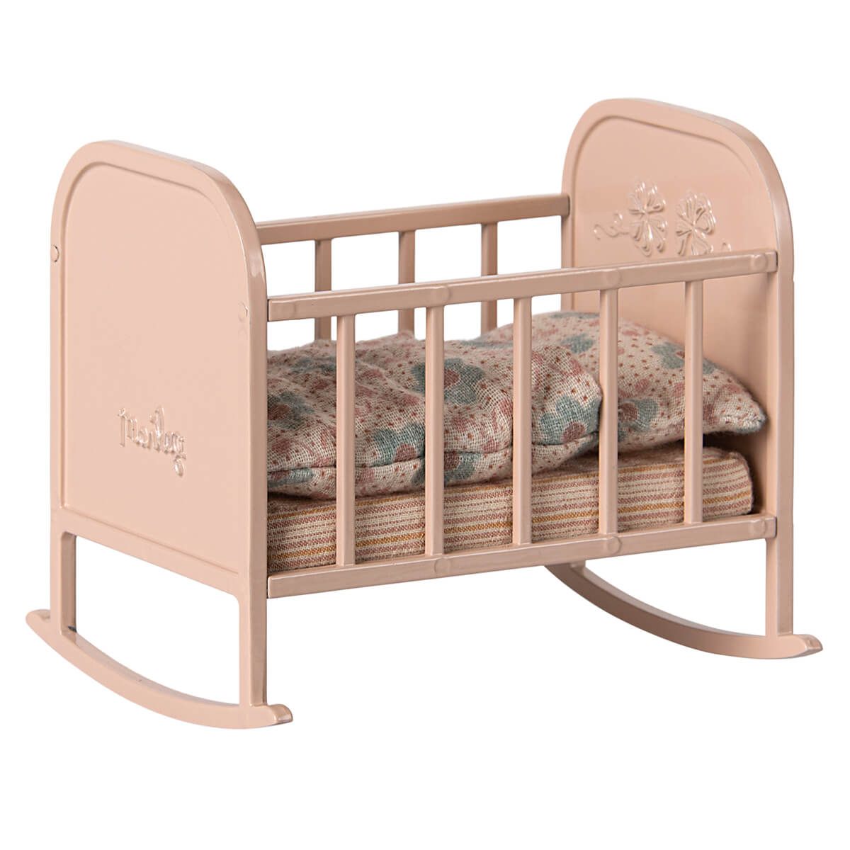 My Cradle by Maileg. A beautifully designed cradle in metal with a soft sleeping bag and mattress inside. The cradle has a small flower embossment on the headboard and rounded legs so you can rock the little ones to sleep. For My Baby Bunny and Baby Mice.