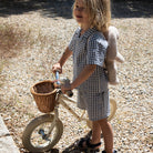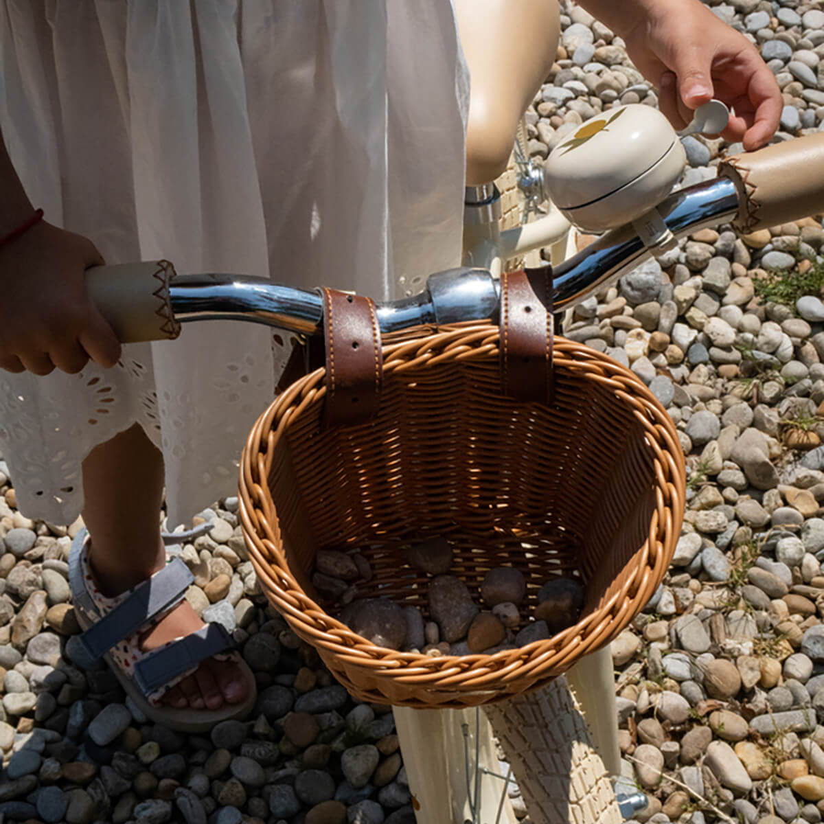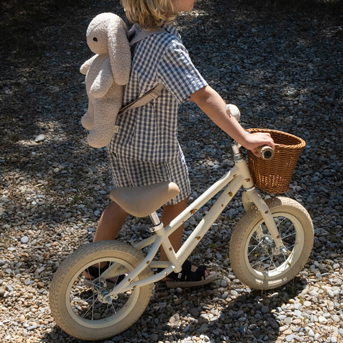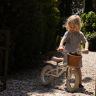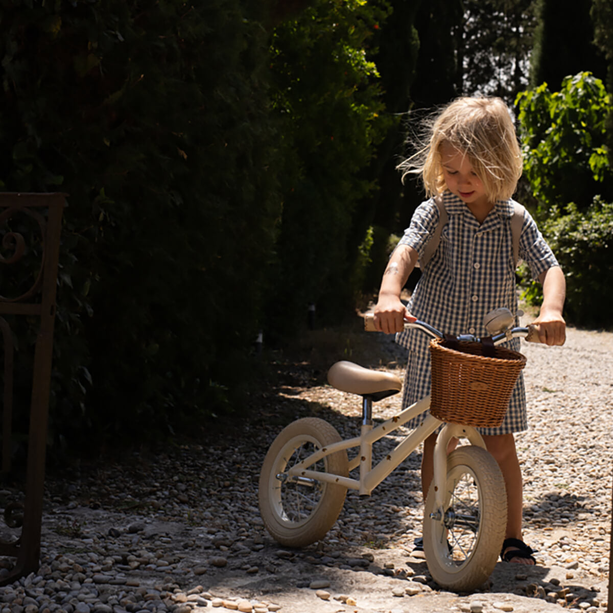 Balance bike by Konges Sløjd. Balance bicycle for new little cyclists that want to learn how to ride. Steel frame with rubber tyres, a bell and a wicker basket.