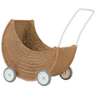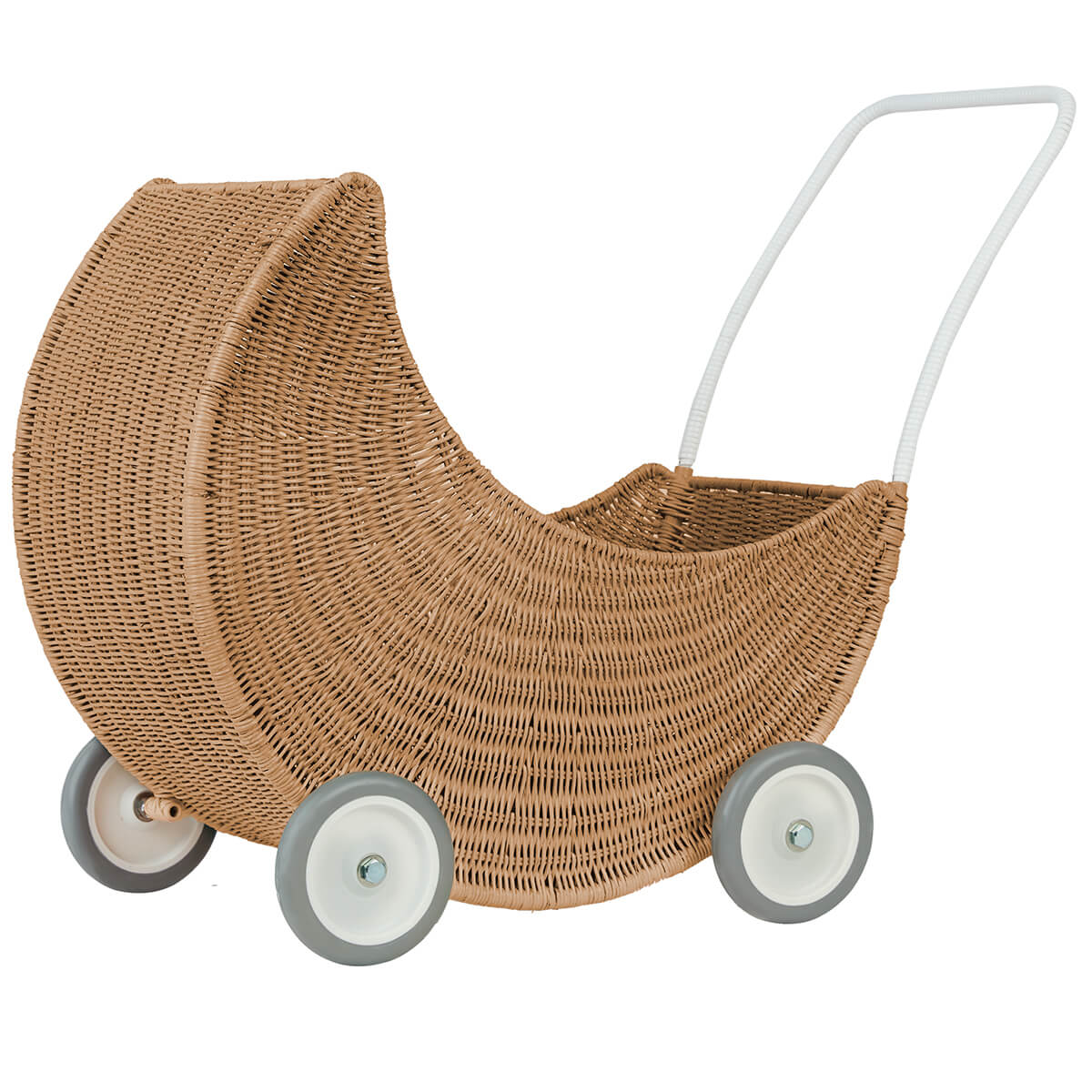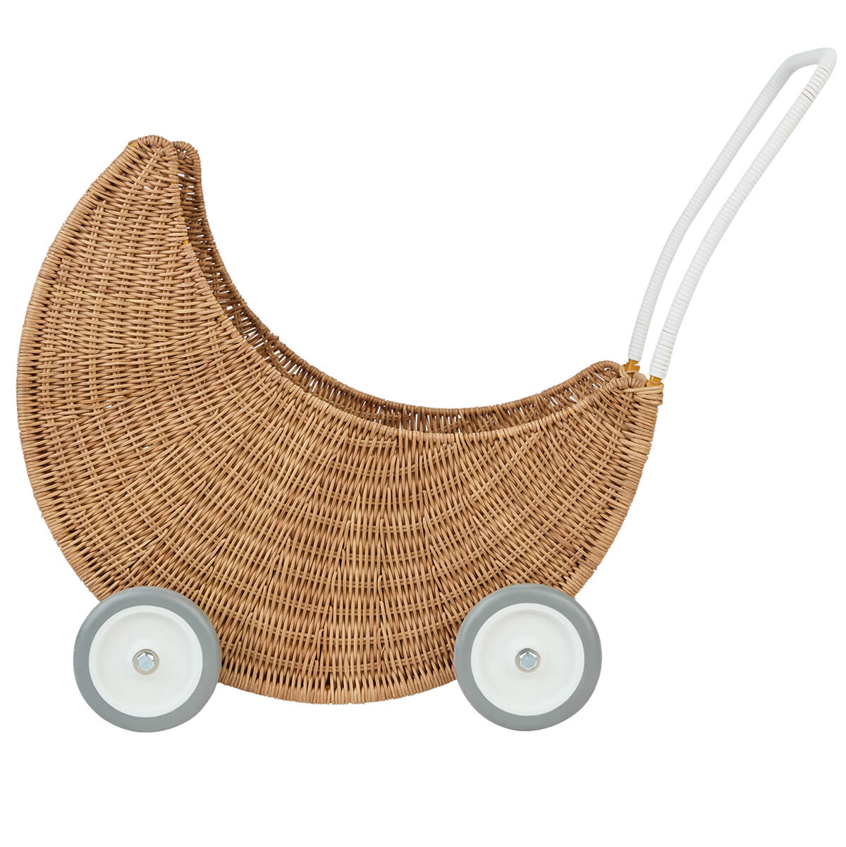 Moon Strolley in Natural by Olli Ella. This strolley is your little one’s new favourite push along toy for whimsical adventures. Crafted from natural rattan, this charming Moon Strolley is inspired by Olli Ella's original Strolley but with a fun twist. Perfectly designed for imaginative play, the Moon Strolley features a beautifully woven frame, sturdy wheels for smooth rides, and a perfectly fits your dolls for all of their journeys.