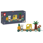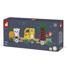 Pull along tropical train by Janod. The train to the tropics is arriving at the station. A 2 in 1 development toy, this pull toy is also a construction game: the 3 wagons are removable and 11 pieces can be stacked to assemble a palm tree, a lemur, a jaguar, a pineapple and a parrot on its perch. This walking toy is perfect for encouraging little ones to move around and helping them develop their gross motor skills. Part of Janod's Tropic collection.