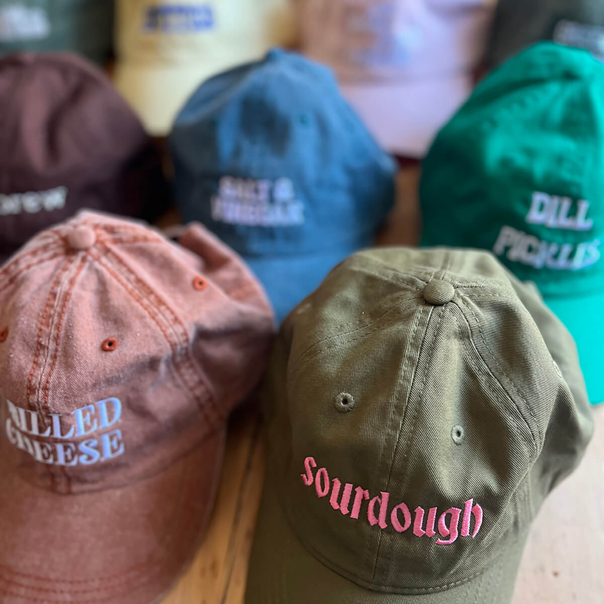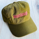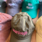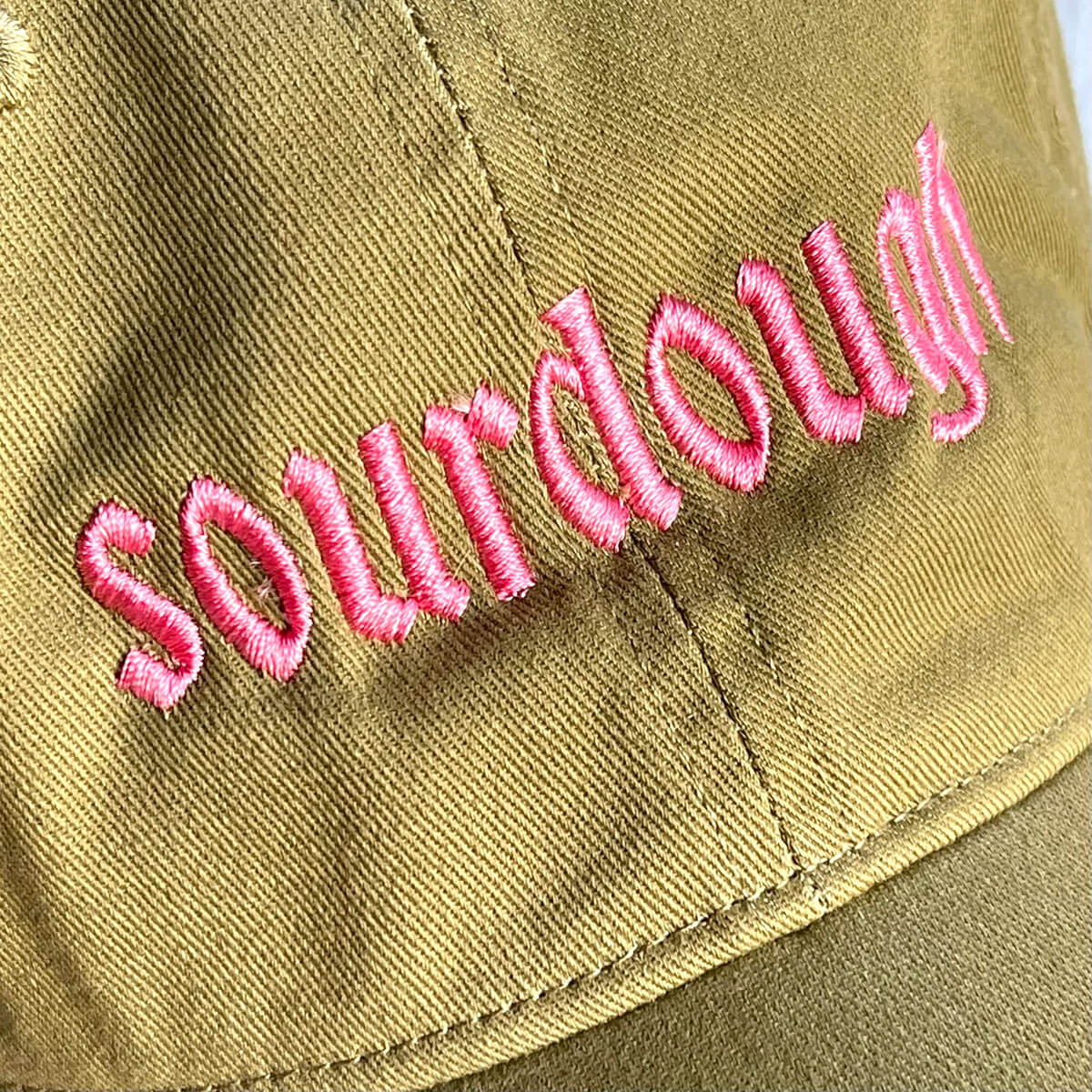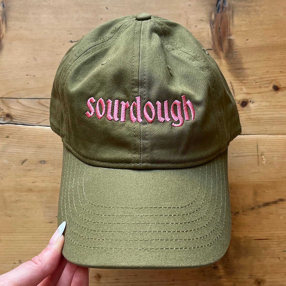 Sourdough Baseball Cap by The Silver Spider. This vintage style 'dad' hat is designed to fit all sourdough lovers. Olive green pigment dyed baseball cap with embroidered 'Sourdough' design in pink, complete with an adjustable strap.