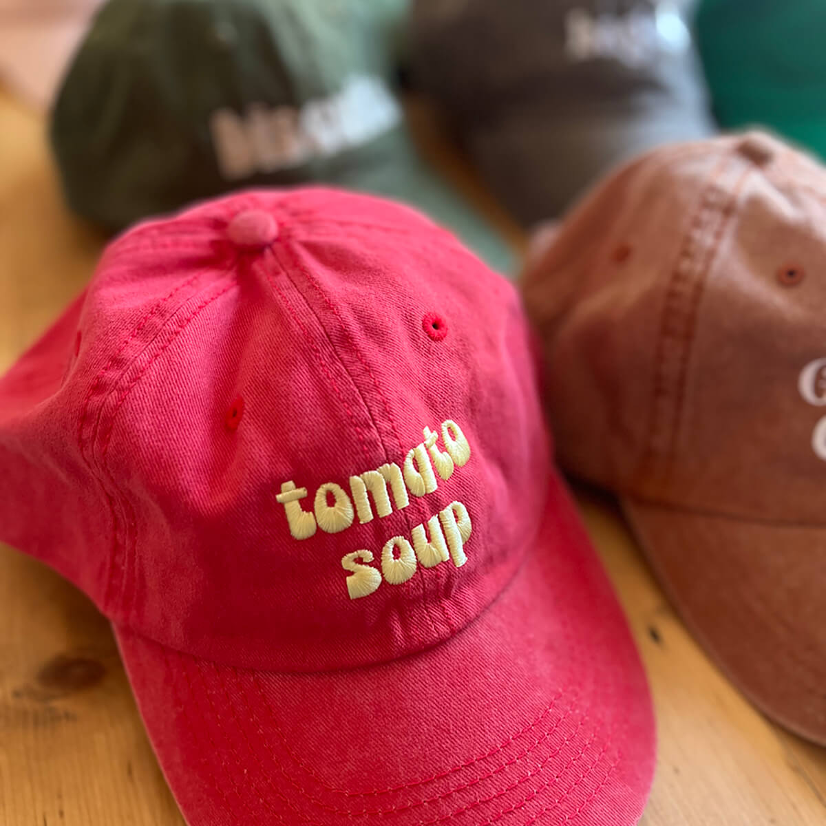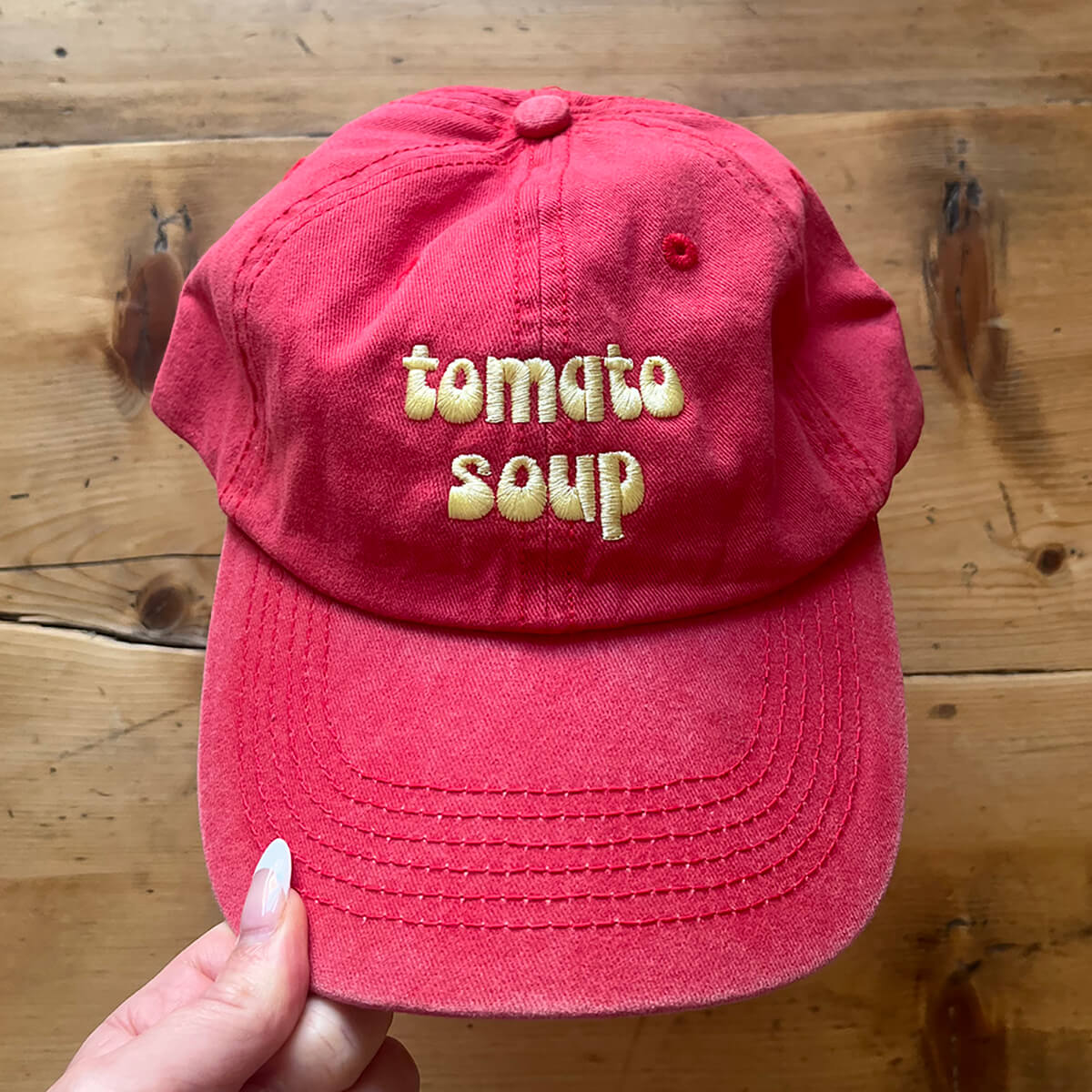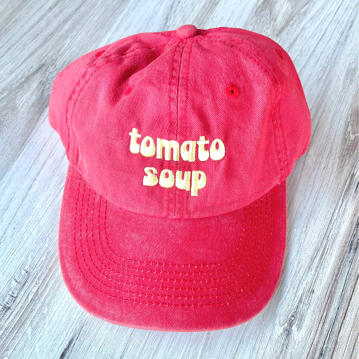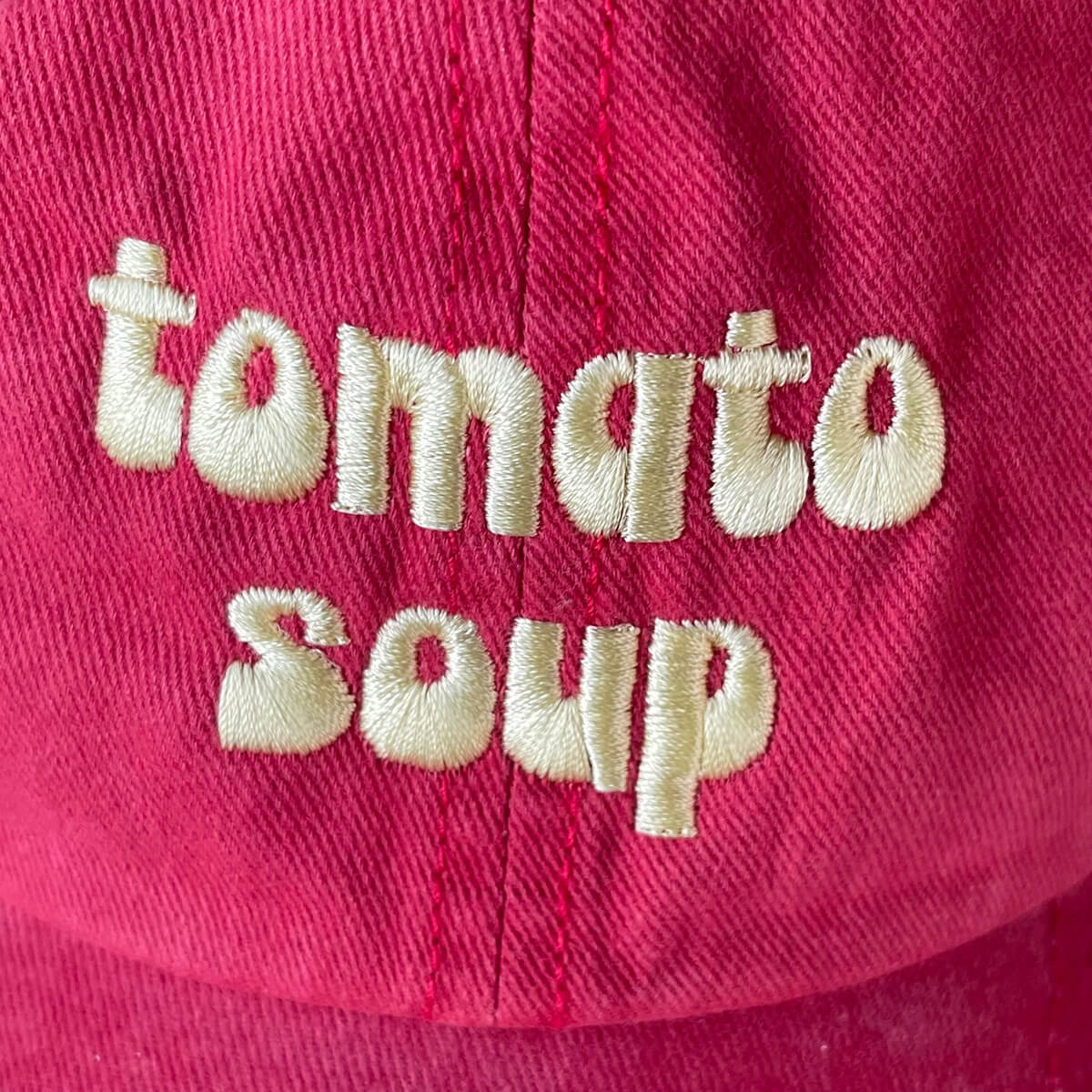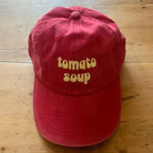 Tomato Soup Baseball Cap by The Silver Spider. This vintage style 'dad' hat is designed to fit all tomato soup lovers. Red pigment dyed baseball cap with embroidered 'Tomato Soup' design in pastel yellow, complete with an adjustable strap.