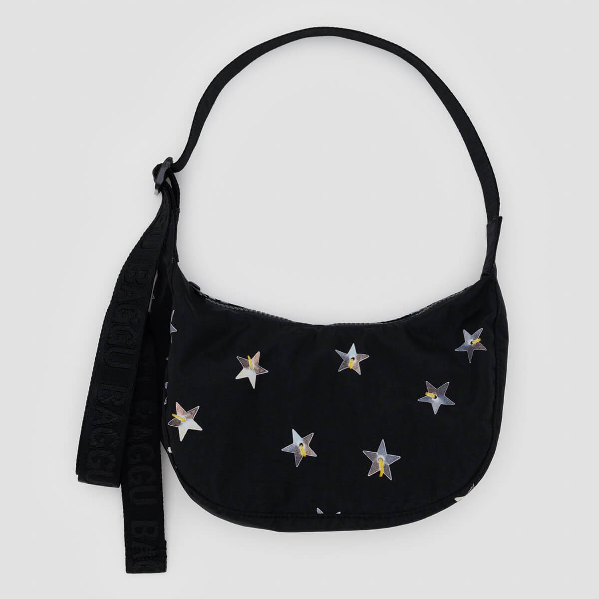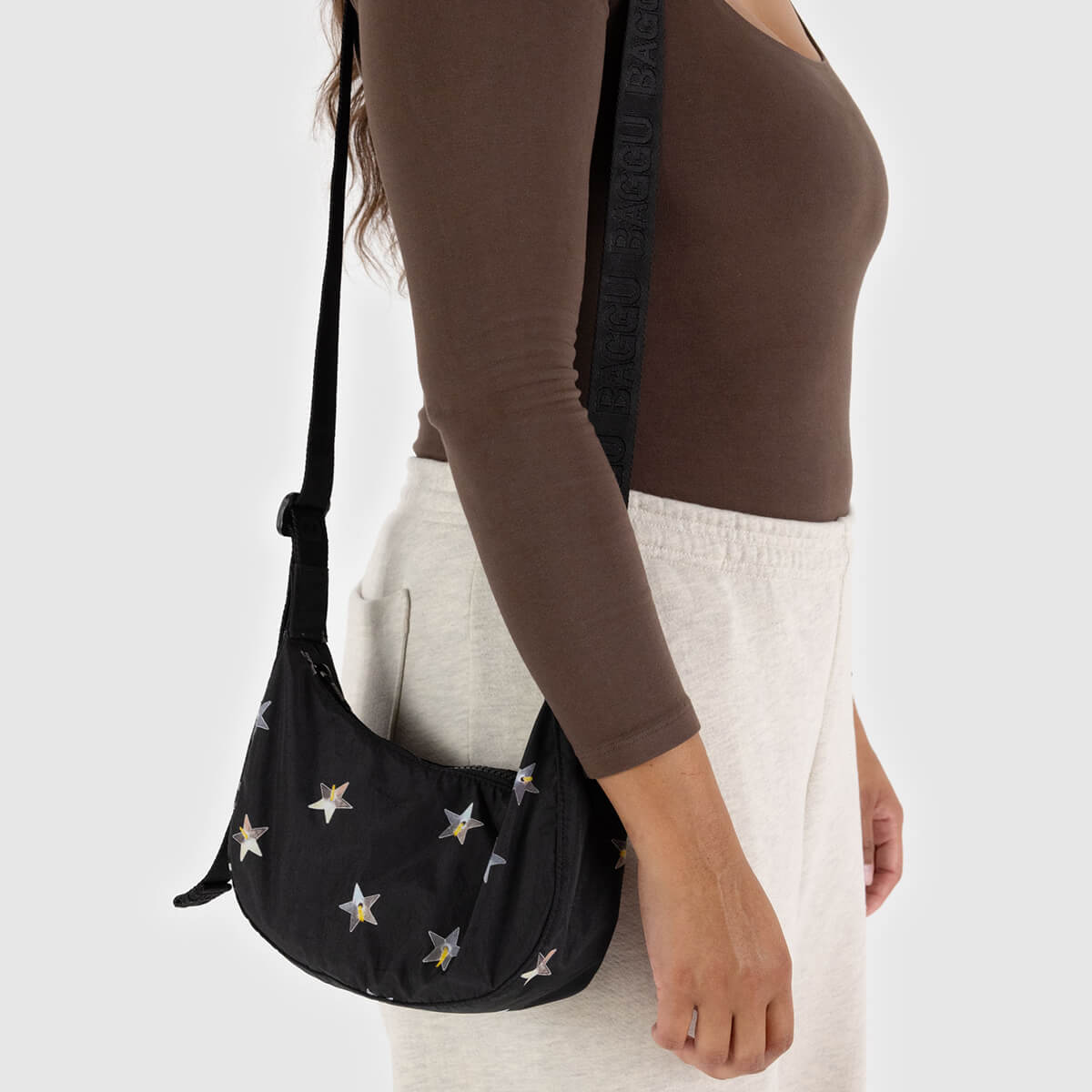 Small Nylon Crescent Bag by Baggu. Smaller size version of the popular Baggu crescent bag that is still roomy enough for keys, a wallet, book and phone. Wear it slung over your shoulder or crossbody for a hands-free experience. Complete with an interior zip pocket that make it easy to stay organised.