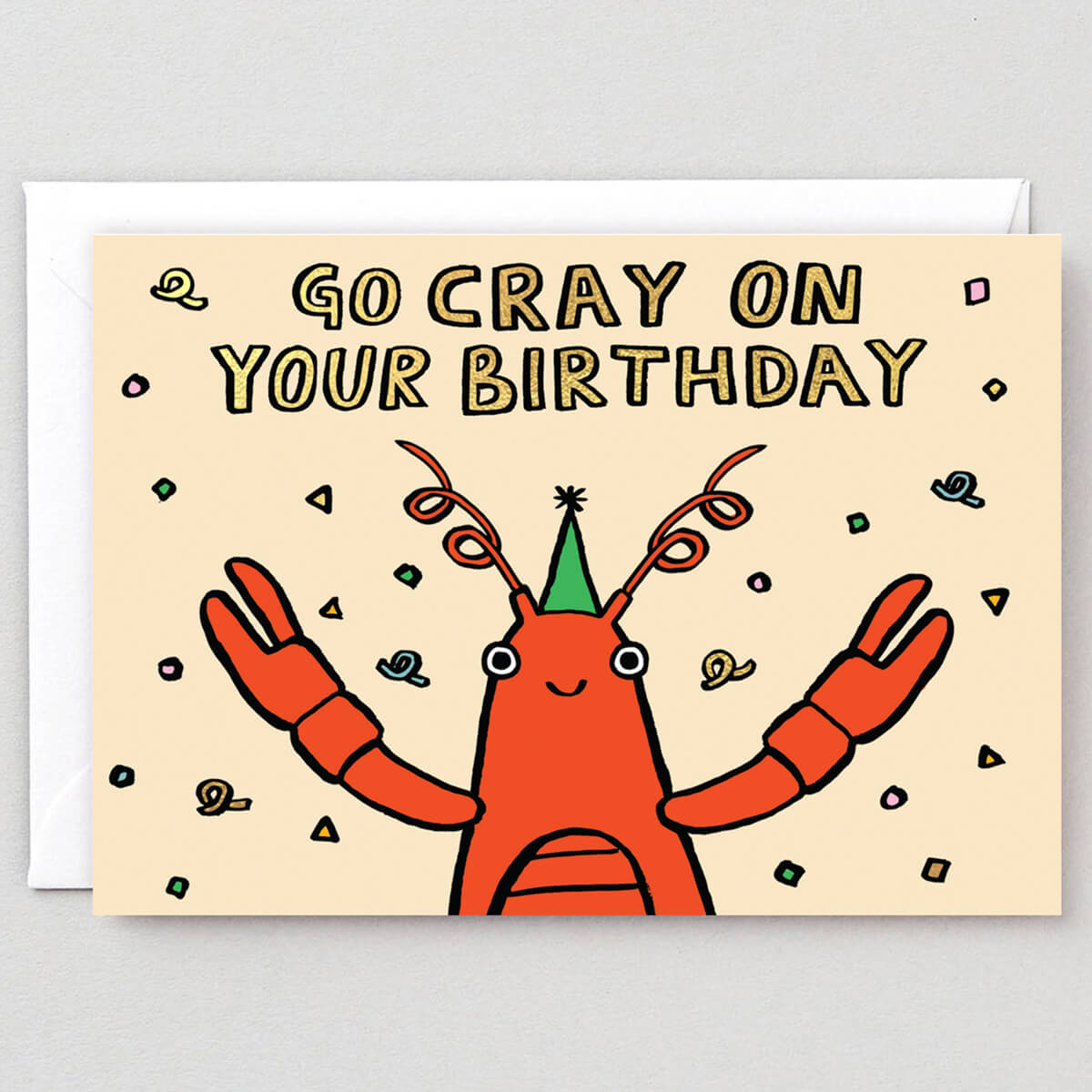 Go Cray On Your Birthday greetings card by Alice Bowsher for Wrap. Cray-cray crayfish! A fresh, funny card designed by London-based illustrator Alice Bowsher. Finished with gold foil for an extra pinch of birthday sparkle. Illustrated in Alice Bowsher’s signature style using brush and black ink. Blank inside with plain white envelope.