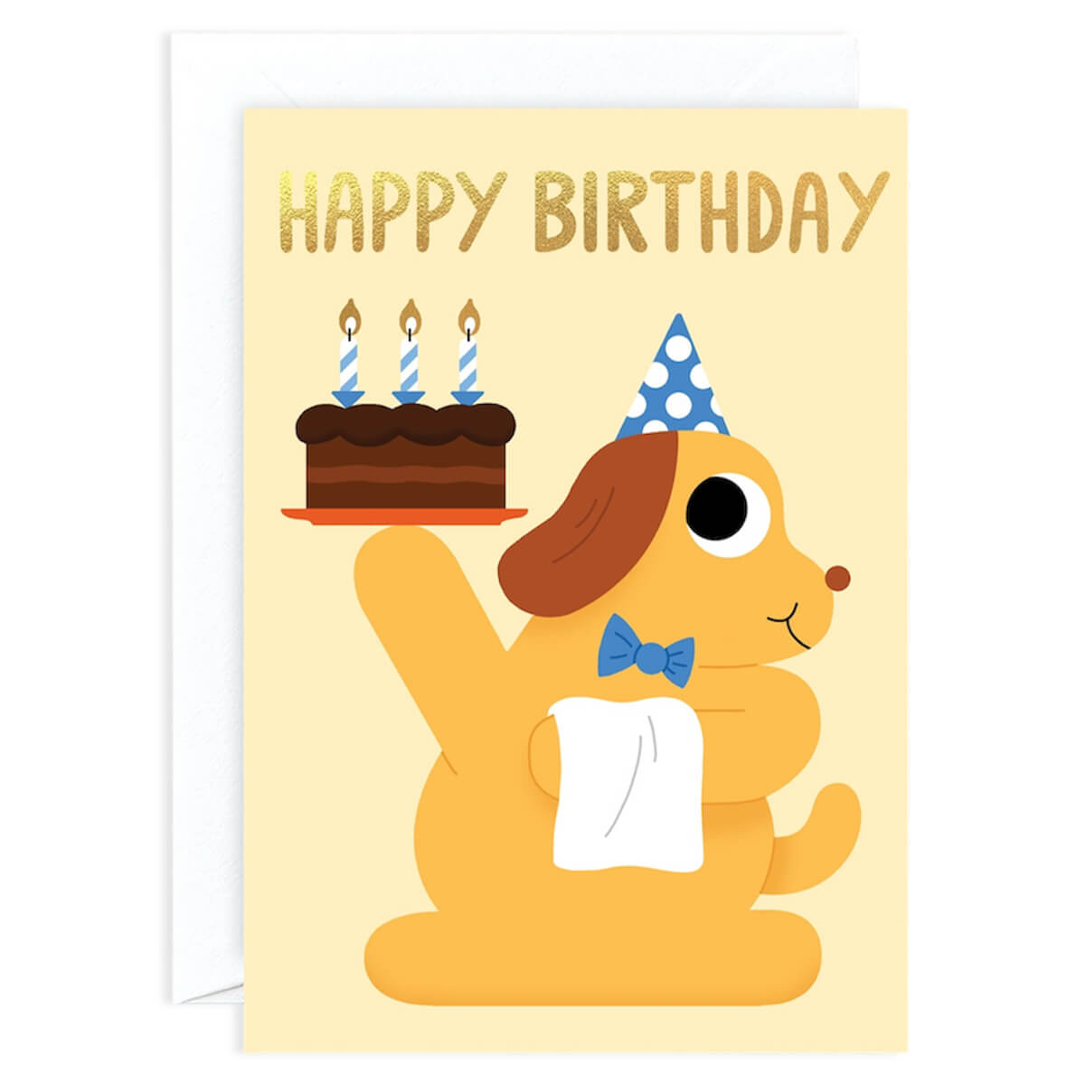 Happy Birthday Cake And Dog birthday greetings card by Elliot Kruszynski for Wrap. This cute canine is ready with cake and candles. Designed in an irresistibly fun-filled style, this birthday card has an extra doggy sparkle and is finished with gold foil detailing. Features an illustration by Elliot Kruszynski. Blank inside with white envelope.