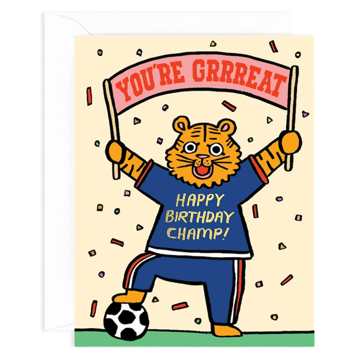 You're Grrreat Birthday greetings card by Alice Bowsher for Wrap. A confetti covered birthday celebration perfect for any little football fan. Illustrated in Alice Bowsher’s signature style using brush and black ink. Blank inside with plain white envelope.