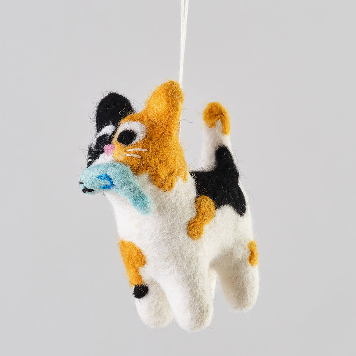 Dwight Felt Decoration by Wrap. Hand needle felted hanging Christmas tree decoration. Dwight the cat is proudly holding a fish in his mouth.