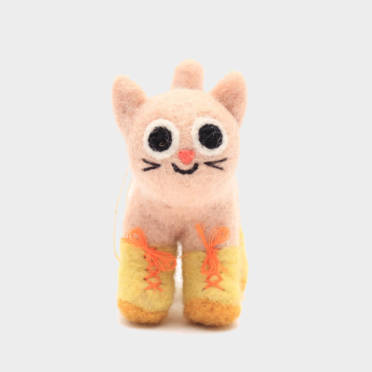 Lucy Felt Decoration by Wrap. Hand needle felted hanging Christmas tree decoration. Lucy is a sweet smiling cat with lace up boots.
