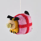 Ludo Felt Decoration by Wrap. Hand needle felted hanging Christmas tree decoration. Ludo is all wrapped up in a festive gift with a tennis ball in his mouth!