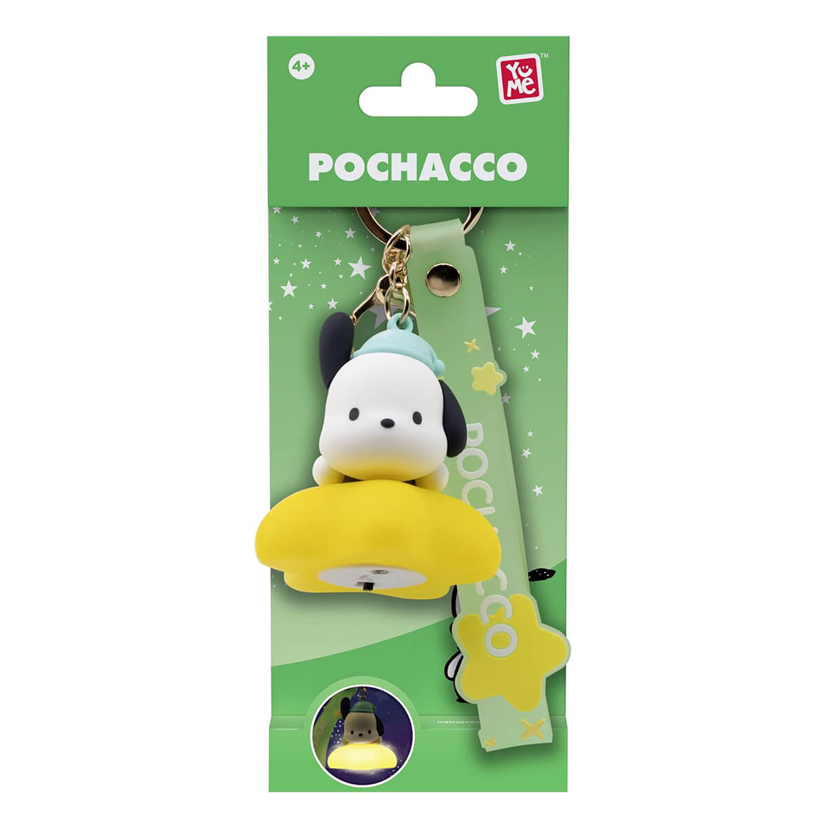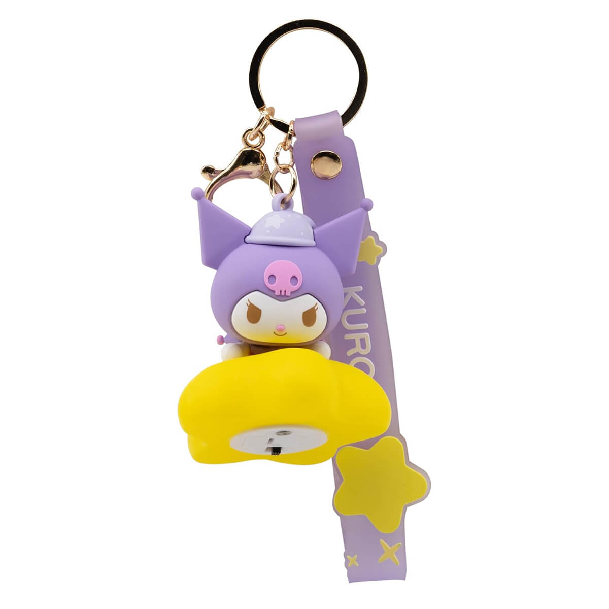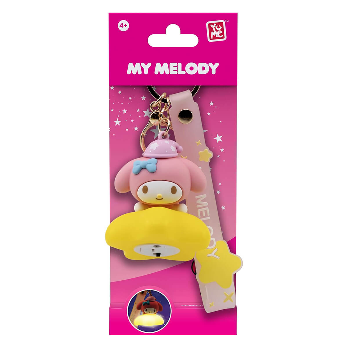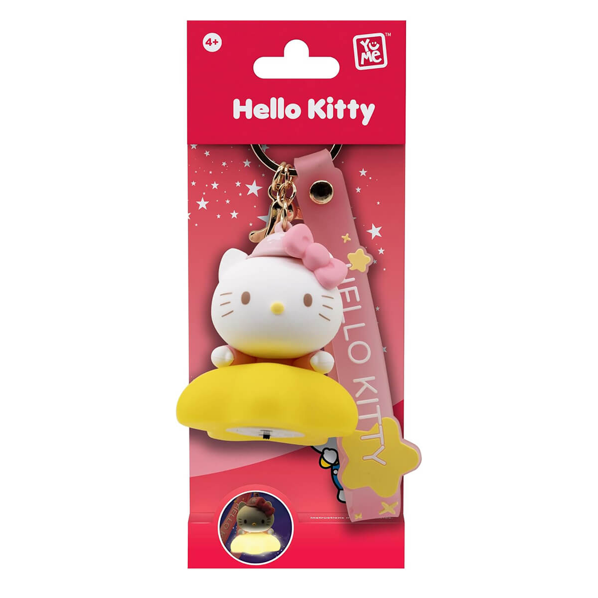 Hello Kitty character keyring light up series by Yume. Sweet Sanrio character charm keyrings to clip onto your bag. Metal keyring with wrist strap, Sanrio character and charm, with an extra quick-release clip to fasten the keyring onto your bag, purse or pencil case. This series features your favourite Sanrio characters which light up with a magical glow.