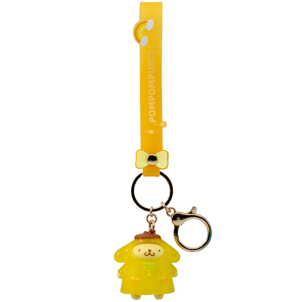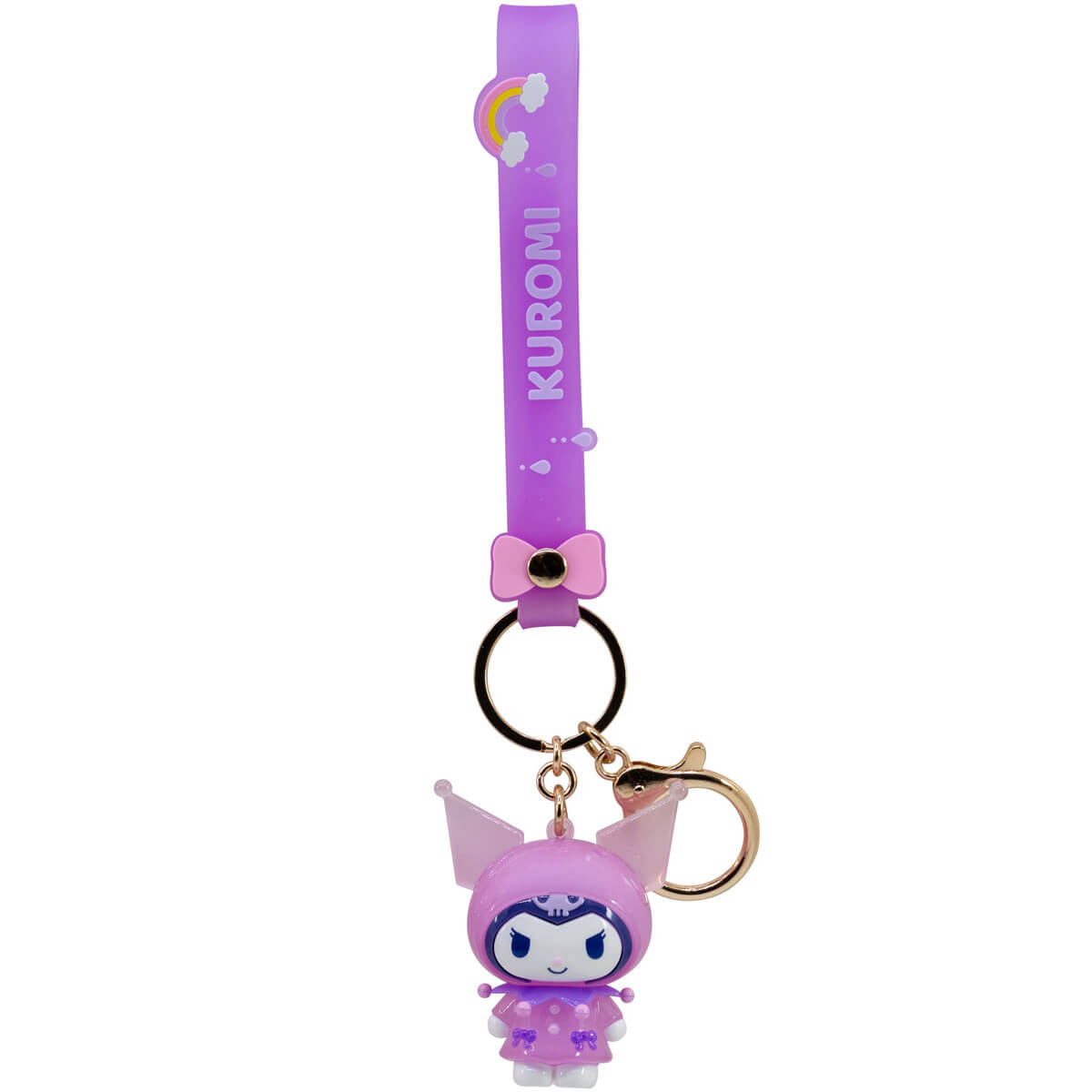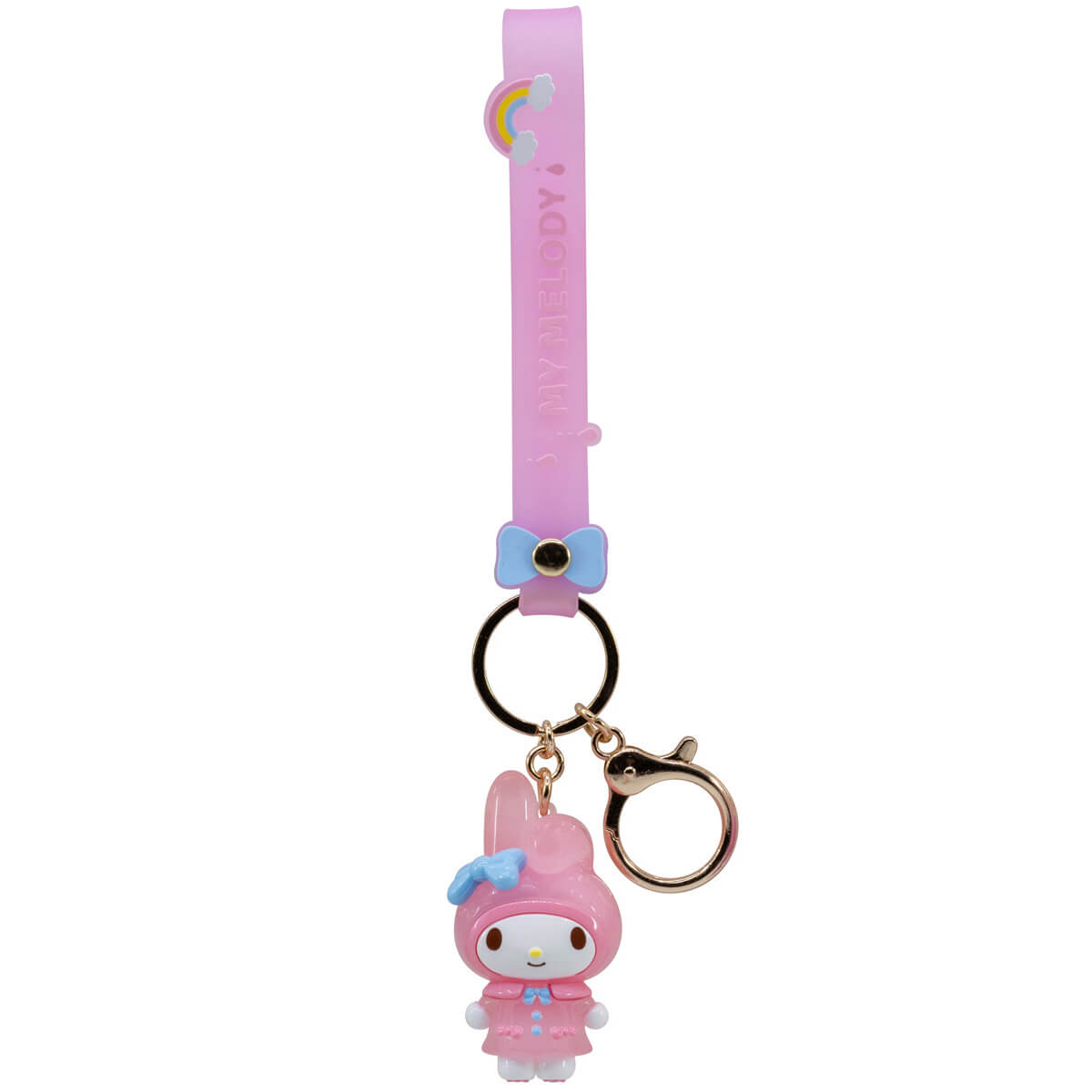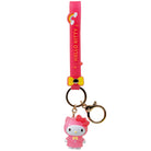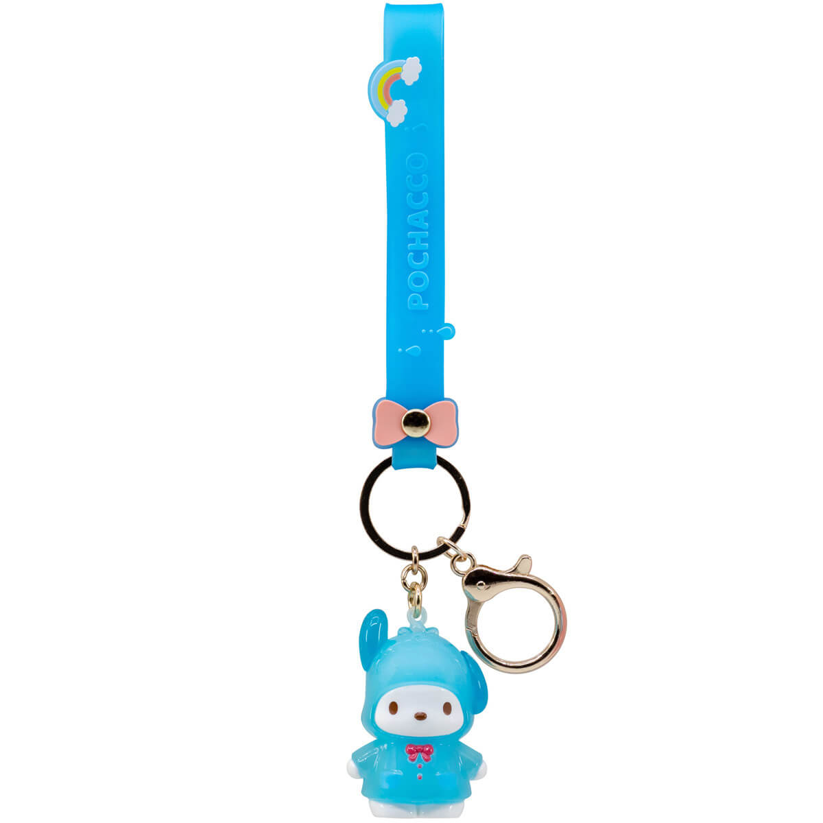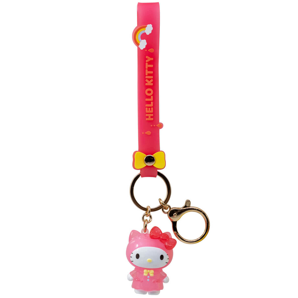 Hello Kitty character keyring Raincoat series by Yume. Sweet Sanrio character charm keyrings to clip onto your bag. Metal keyring with wrist strap, Sanrio character and charm, with an extra quick-release clip to fasten the keyring onto your bag, purse or pencil case. This series features your favourite Sanrio characters in shiny translucent raincoats to match each characters signature colour.