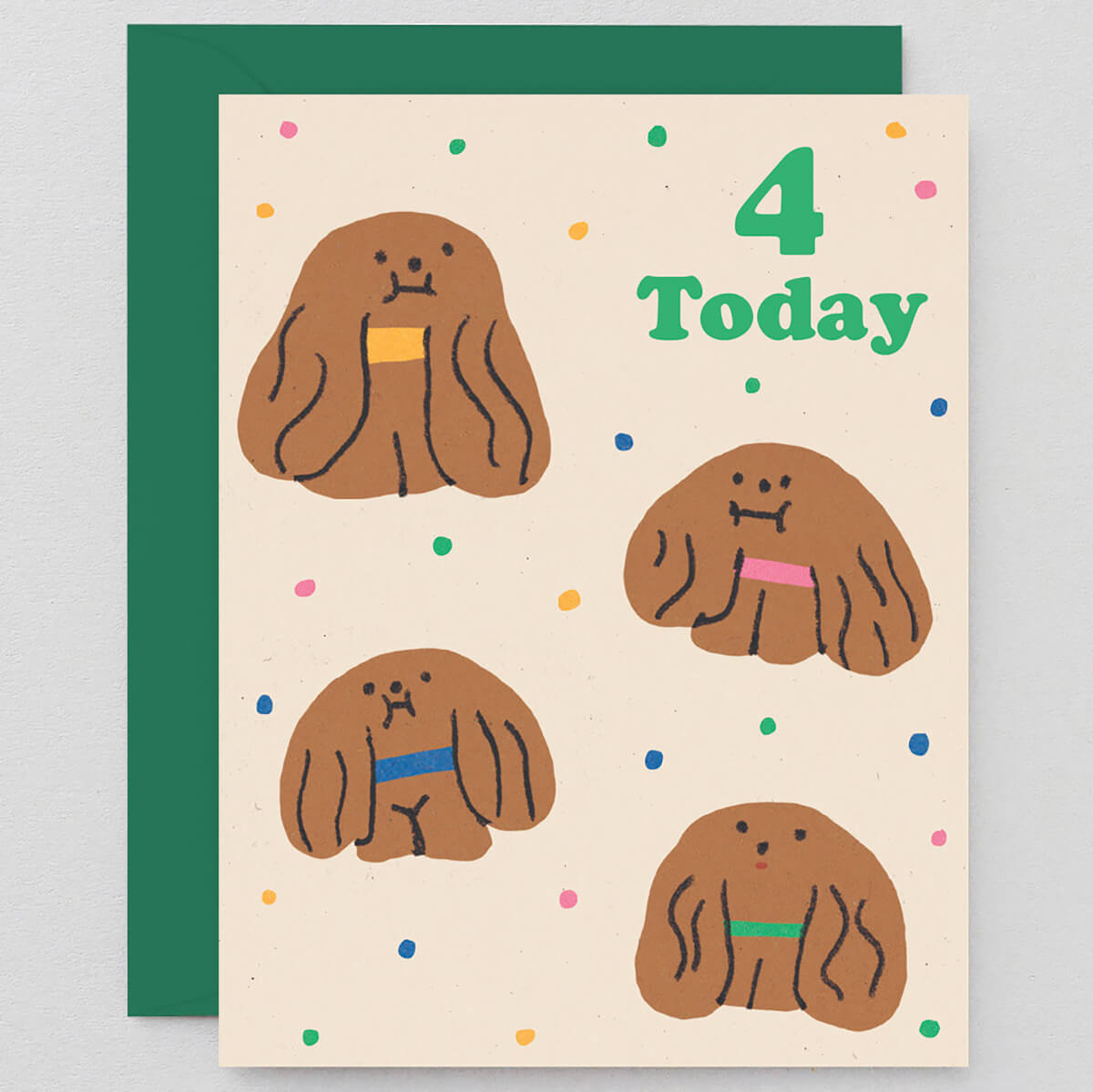4 Today age greetings card by Maria Ramos for Wrap. Features an illustration by Maria Ramos. Blank inside with an emerald green envelope.