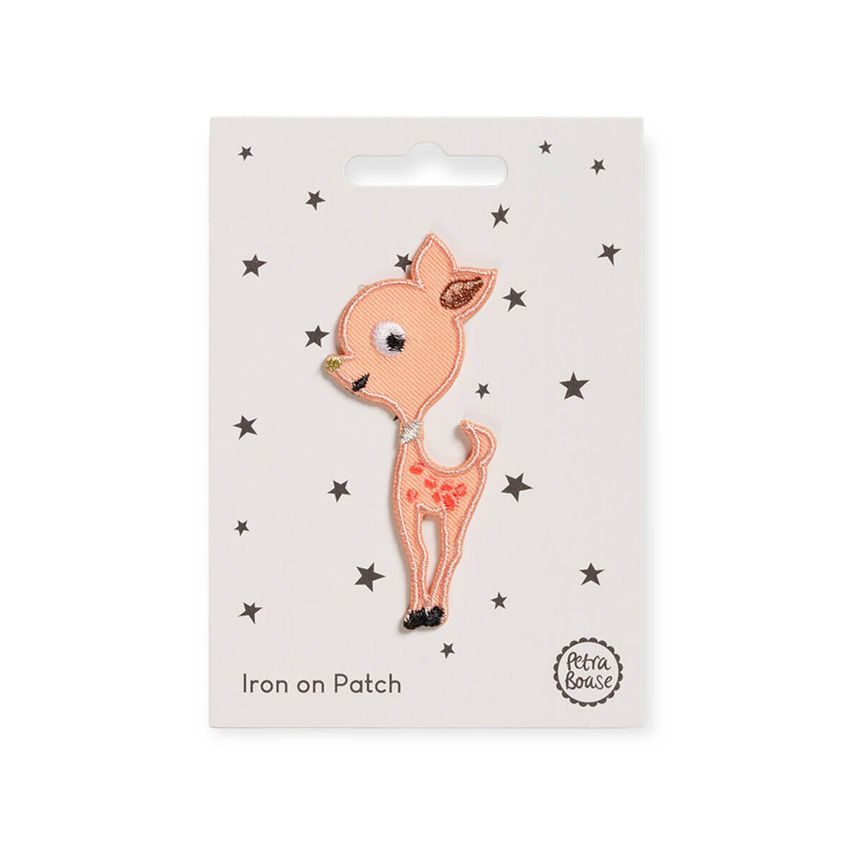 Baby Deer iron on patch by Petra Boase. Richly embroidered colourful patch, with an iron-on backing so can be removed from the card and ironed on to a favourite t-shirt, rucksack or whatever you like! The patch is peach, with multi coloured embroidered detailing.