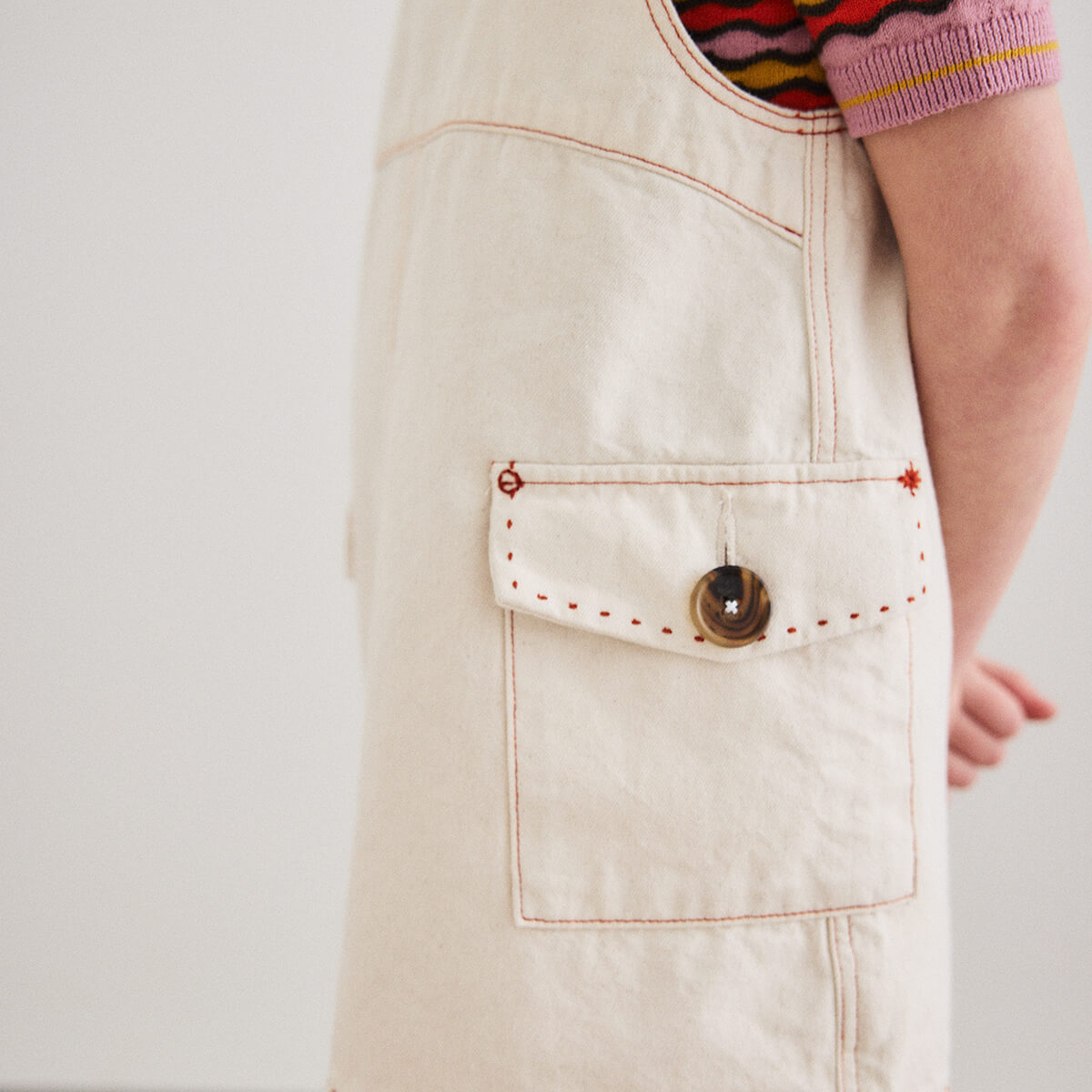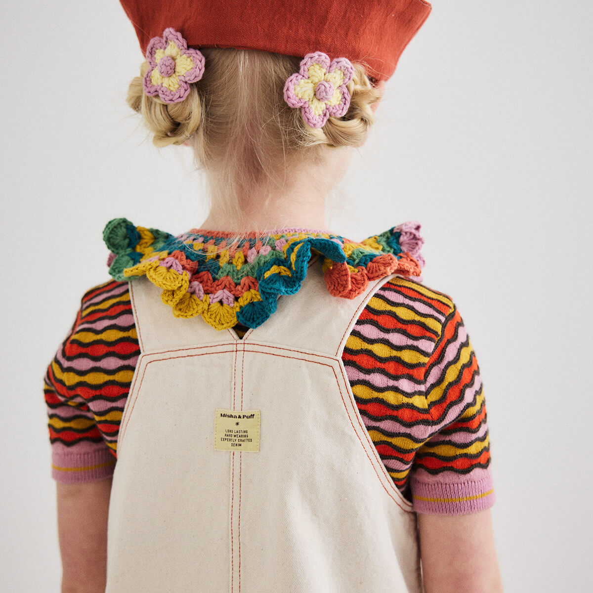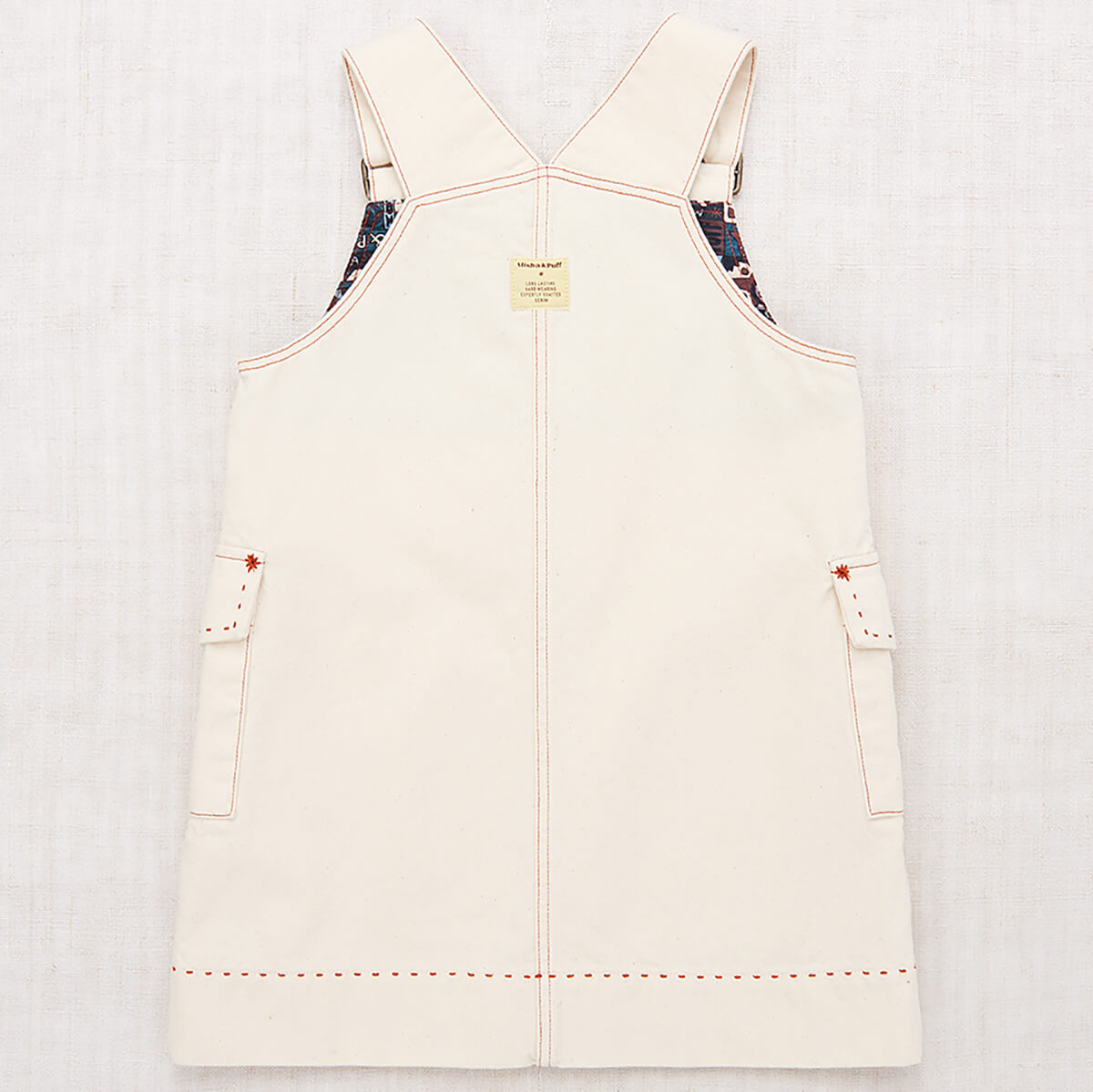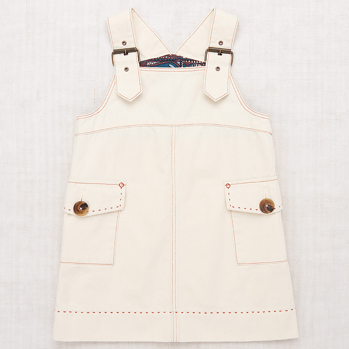 Buckle Jumper Dress by Misha & Puff. A vintage-inspired jumper dress in 100% cotton denim, featuring adjustable buckle straps, two patch pockets with horn button closure, a print-lined bib, and contrast topstitch detail. Finished with hand-tacked stitches instead of rivets for softness.