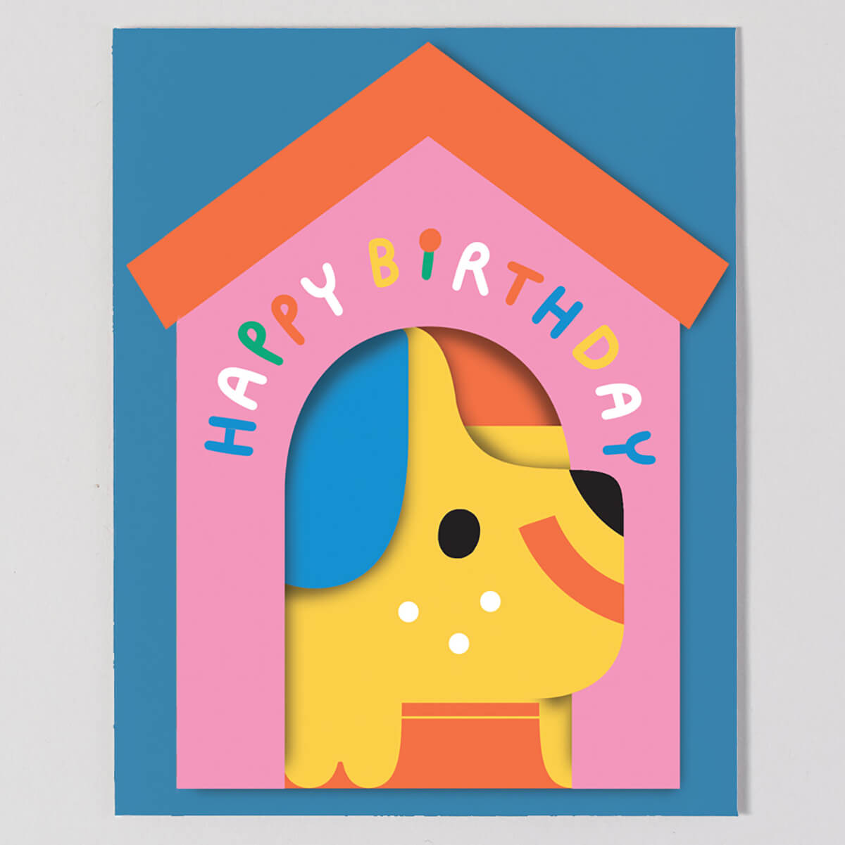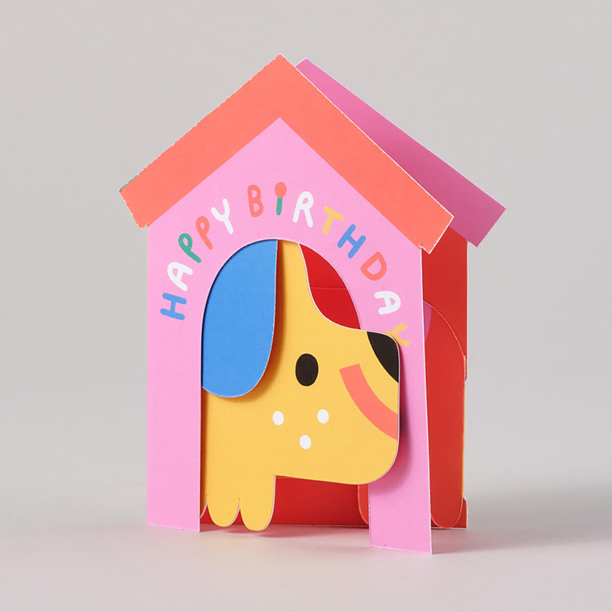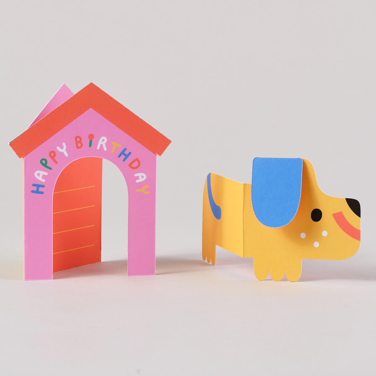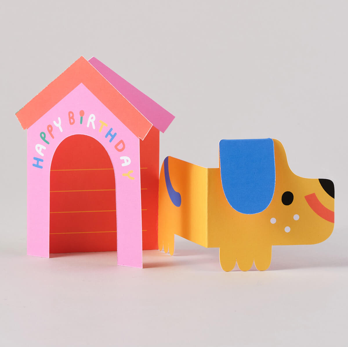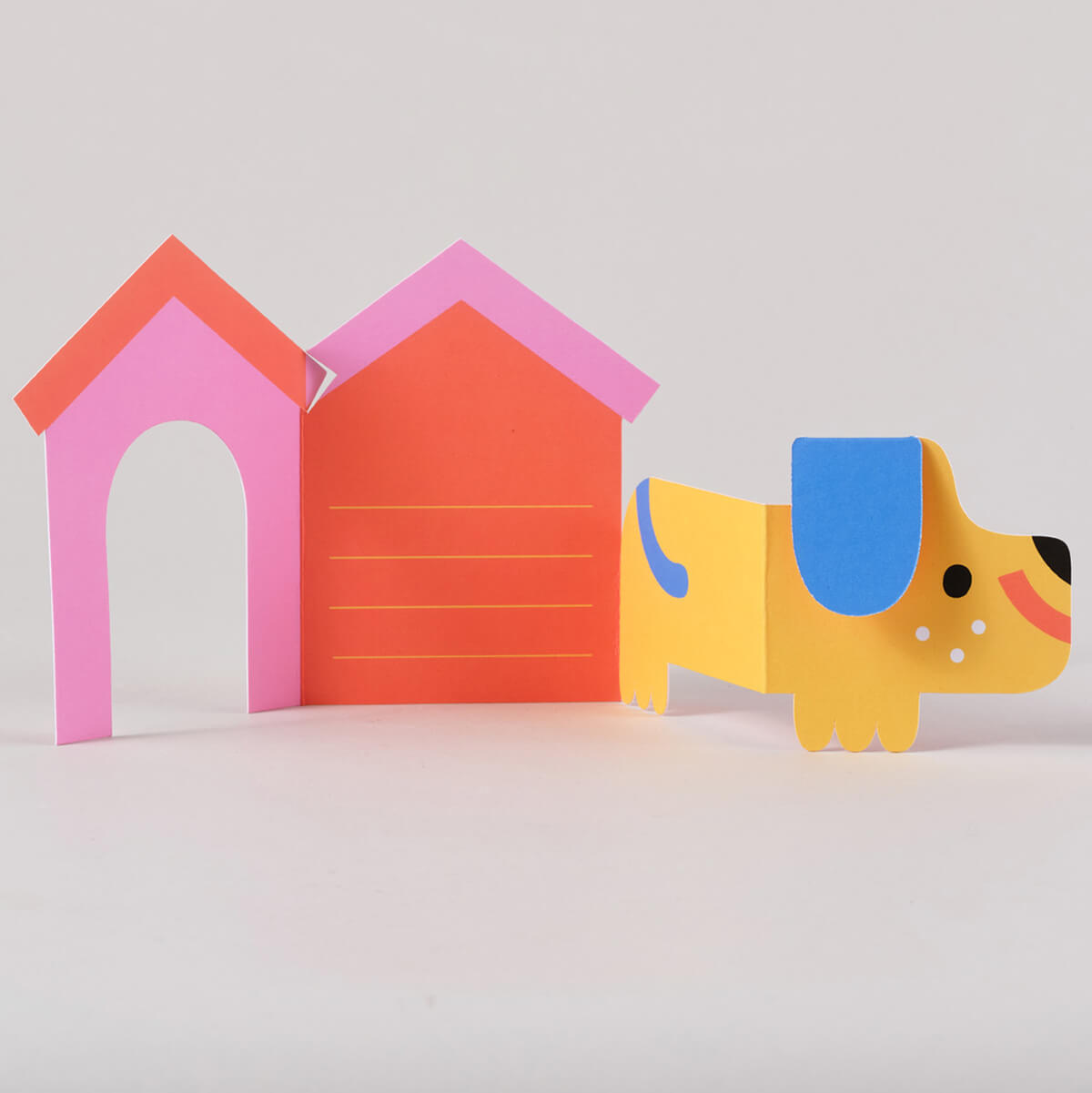 Dog In House fold out birthday greetings card by Susie Hammer for Wrap. This cute little dog is popping out to say Happy Birthday. This fun fold out card is sure to please all ages. Designed by Susie Hammer in her signature simple shapes and vivid colour. Includes a lined section inside the card to write your message on. Blue envelope included.