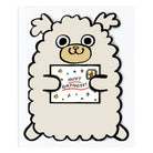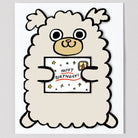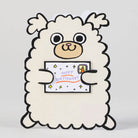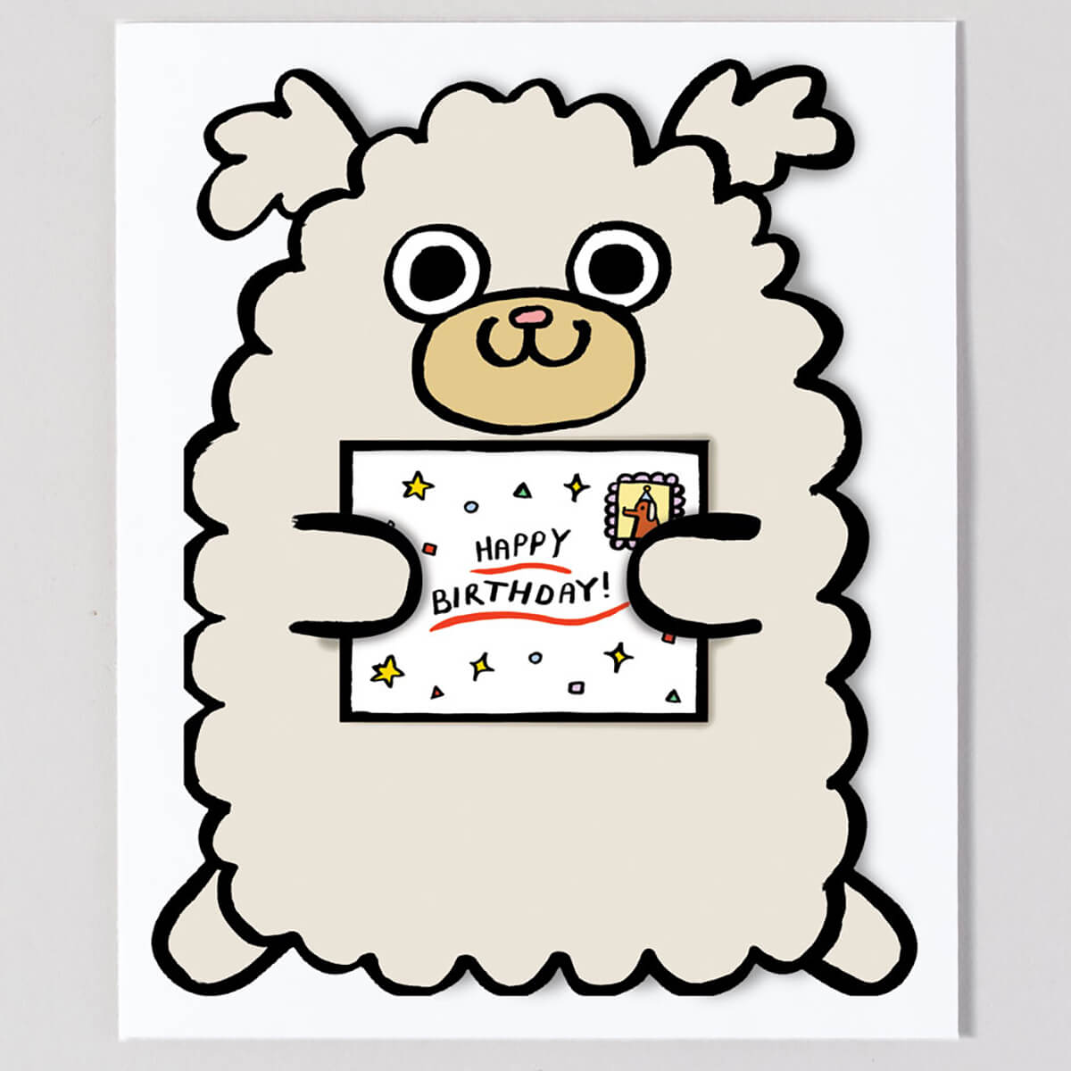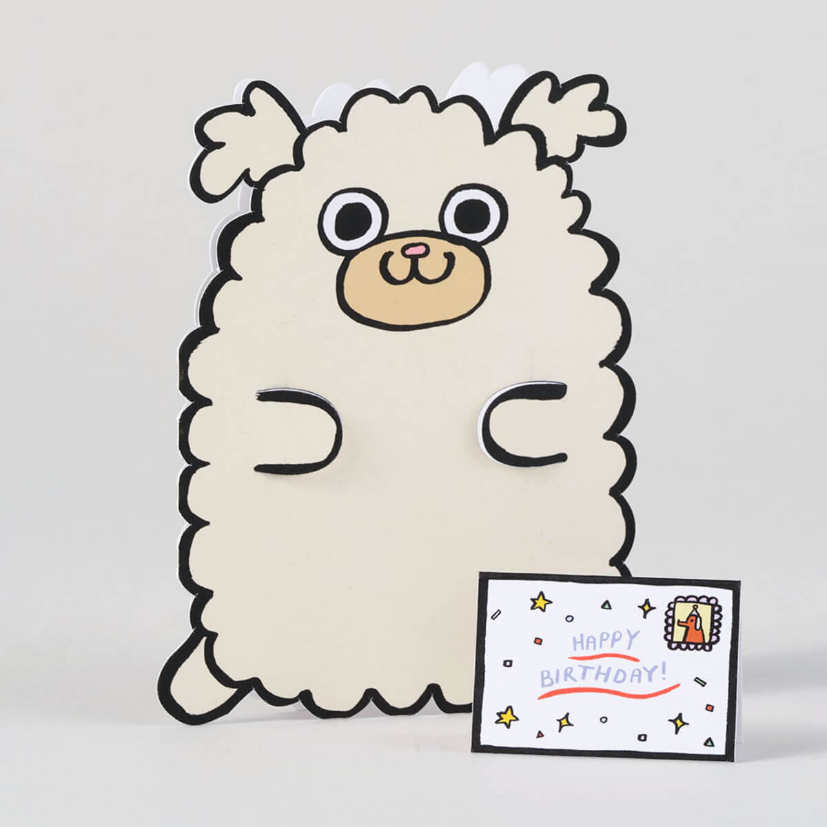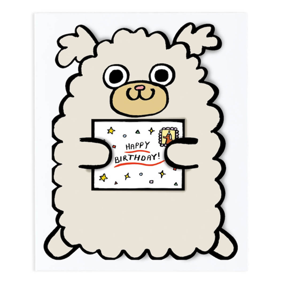 Dog With Mini Card Die Cut Birthday greetings card by Alice Bowsher for Wrap. A cute fluffy birthday dog with a small extra card included. Illustrated in Alice Bowsher’s signature style using brush and black ink. This die cut card is packed with an individual mini birthday card. Blank inside with rust coloured envelope.