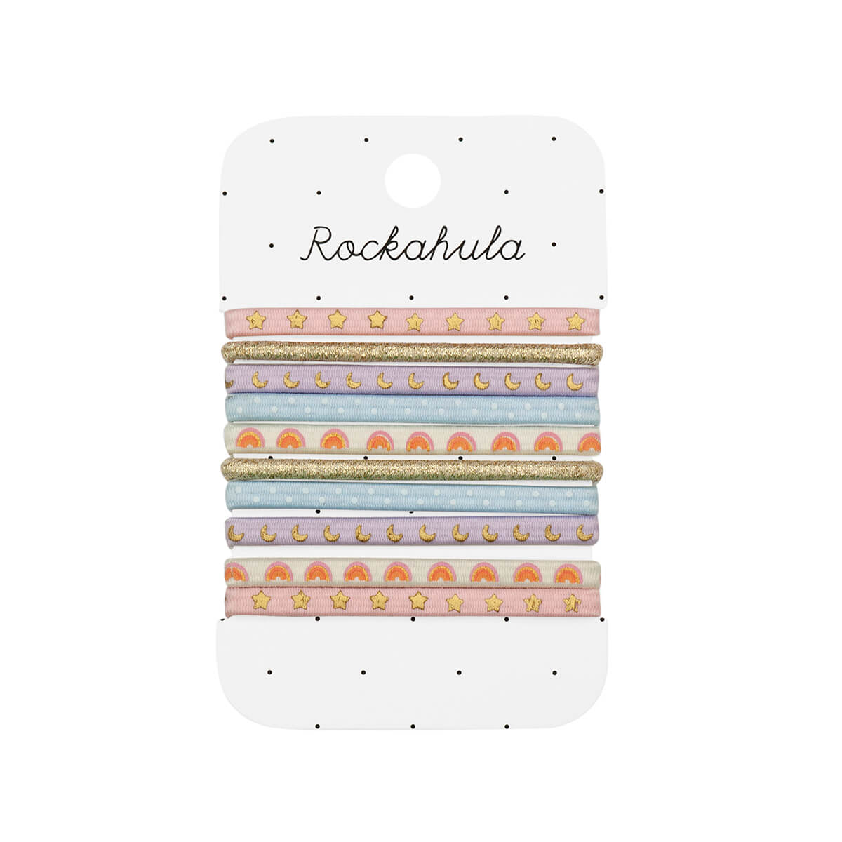 Enchanted Elastic Pony Pack by Rockahula. Fall under a magic spell and discover our world of enchantment. With a selection of designs to choose from in soft tonal colours, this pack of 10 everyday ponies are the perfect way to add a sprinkle sweetness to your hair.
