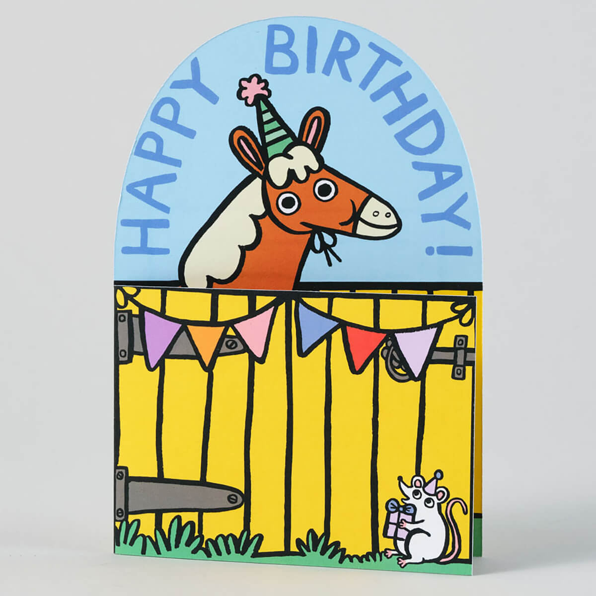 Farmyard Die Cut Birthday greetings card by Alice Bowsher for Wrap. This fold out farmyard is ready to party! Say happy birthday with this cut out card, complete with a space to write in the age. Illustrated in Alice Bowsher’s signature style using brush and black ink. This die cut fold out card is also printed on the inside for extra impact. Space on reverse of card for your own message. Includes white envelope.