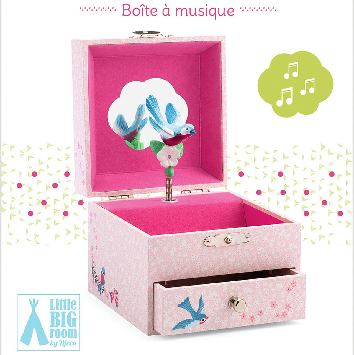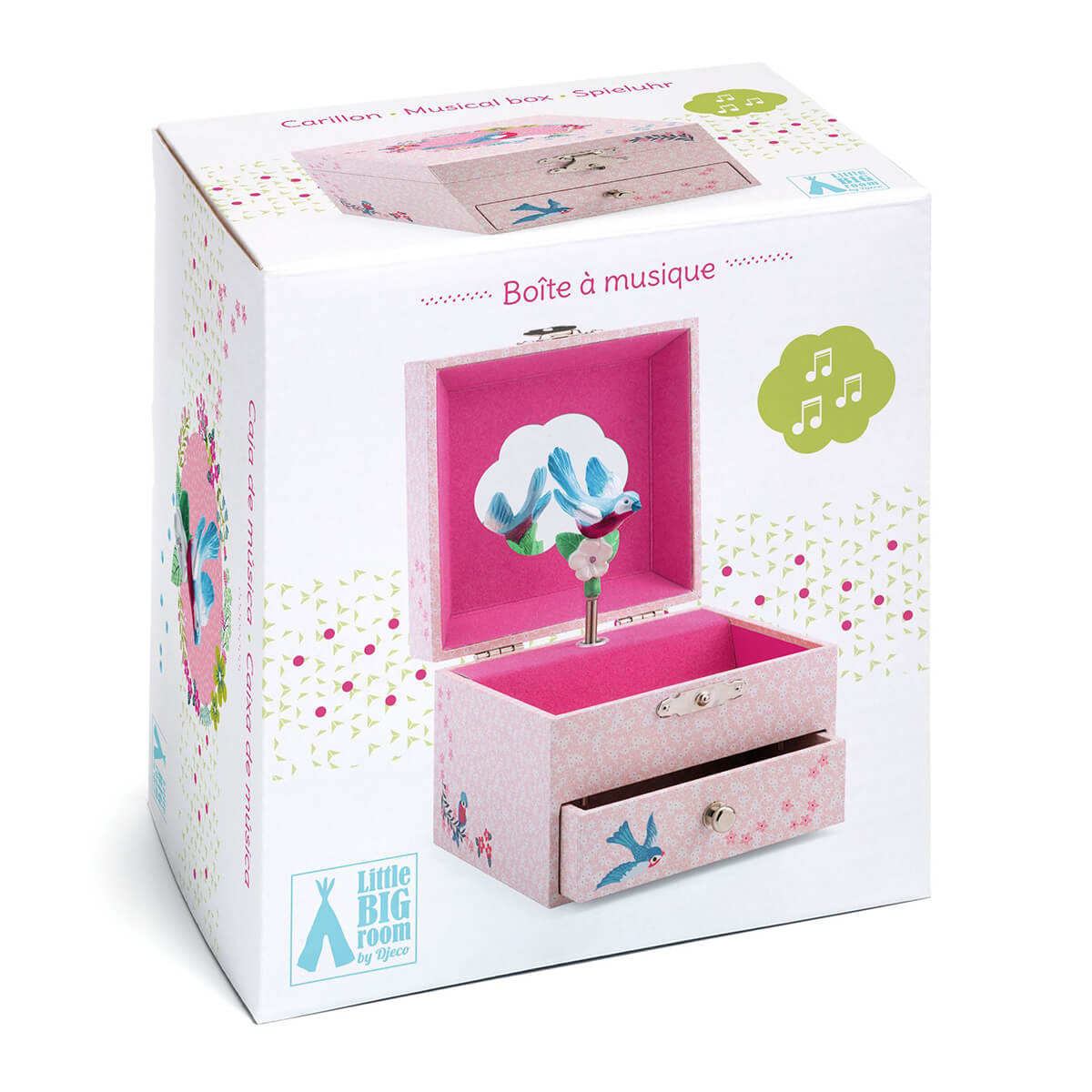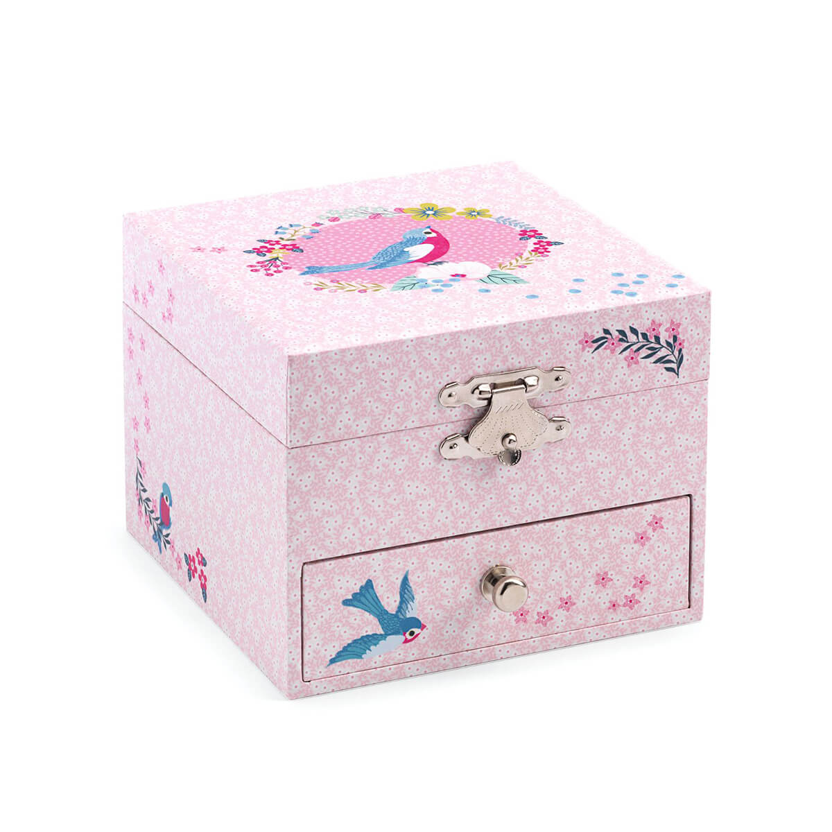 Melody Of The Finch Music Box by Djeco. Finch Melody is a beautifully illustrated music box with a drawer for storing jewels and secrets. Turn the handle, open the box, and surprise: a finely sculpted bird spins and is reflected in a silhouetted mirror to the sound of Antoine Renard's "Le temps des cerises."