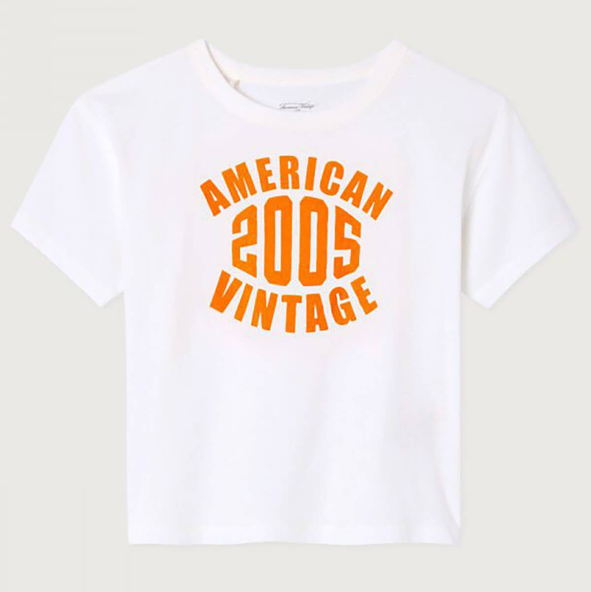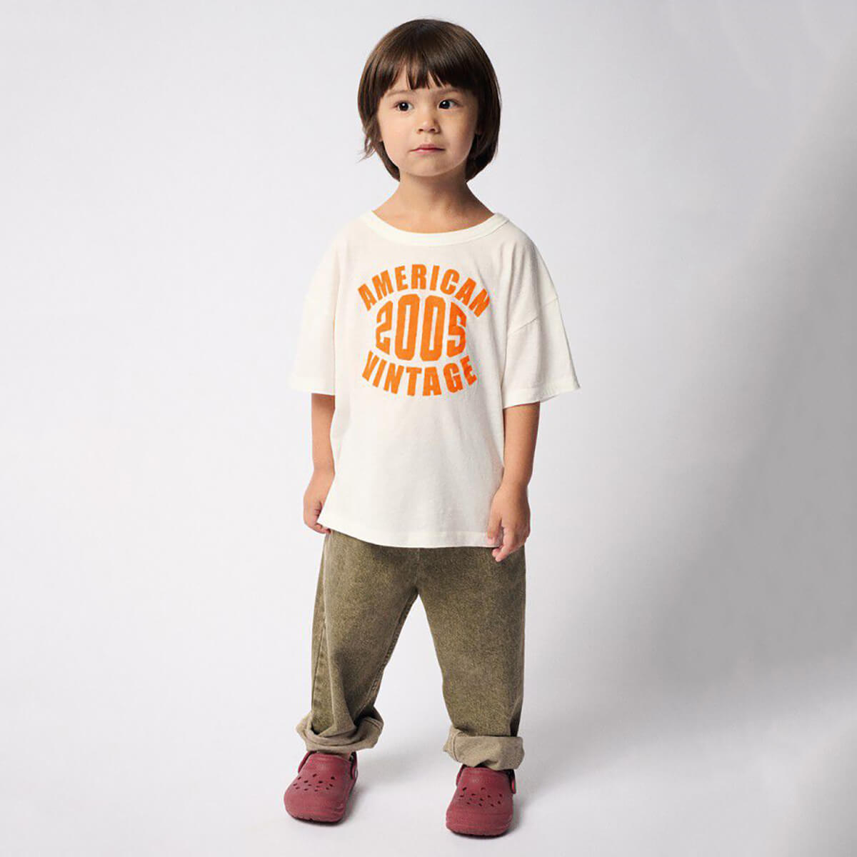 Gamipy kid's Round neck T shirt by American Vintage. Simple straight cut short sleeve tee with a round neck, dropped shoulders and a neon orange graphic print.