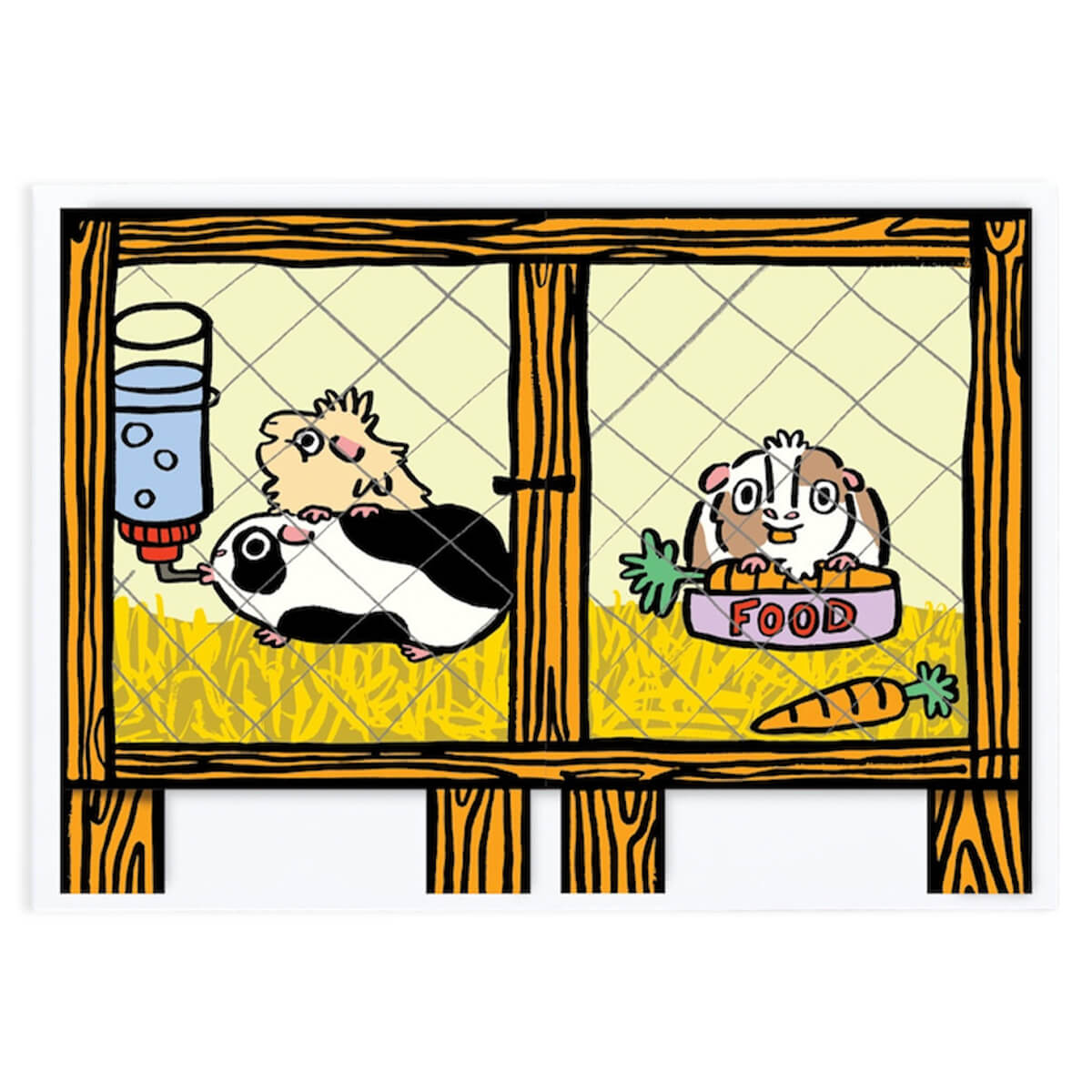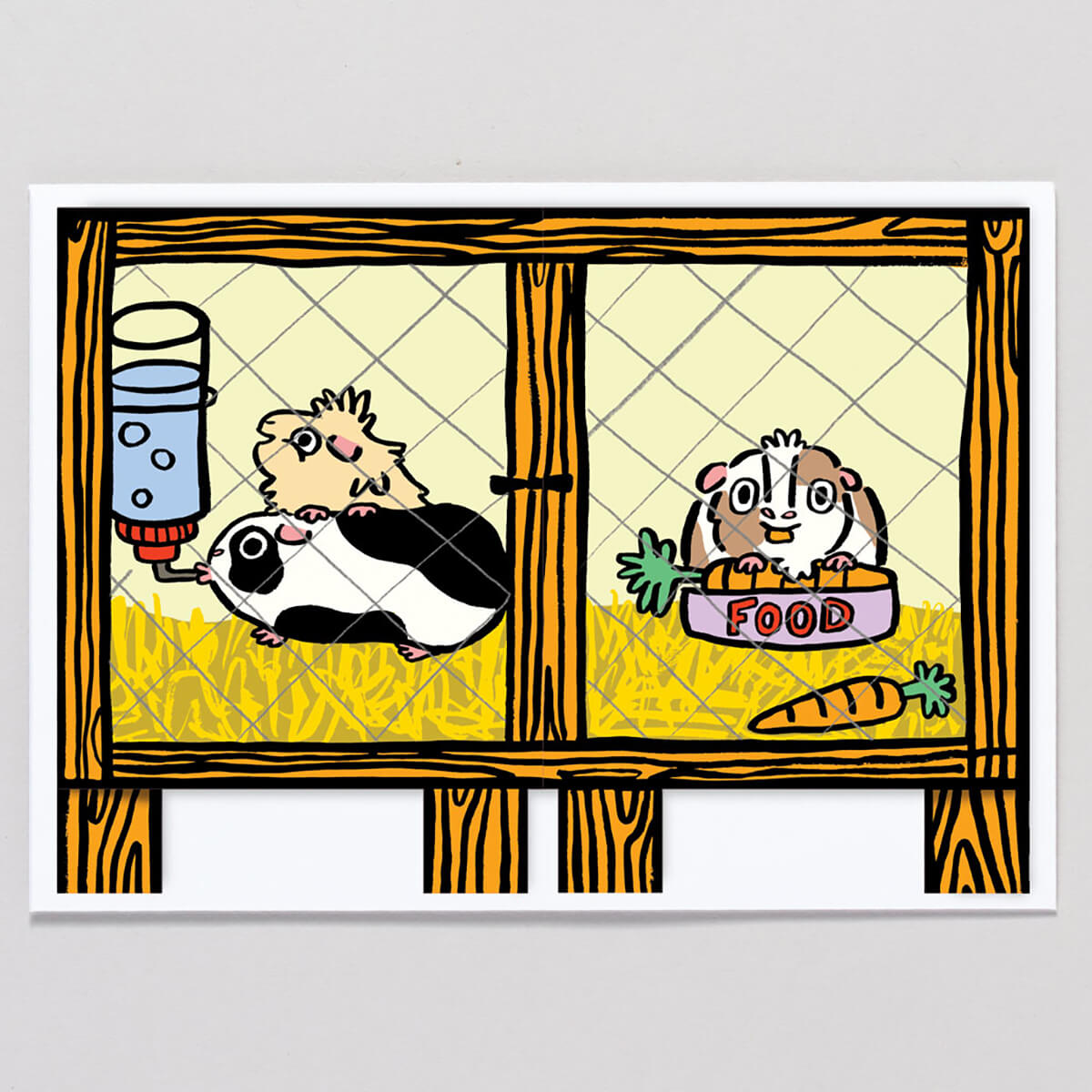 Guinea Pig Surprise Fold Out Birthday greetings card by Alice Bowsher for Wrap. These guinea pigs are having a party and you are all invited! Illustrated in Alice Bowsher’s signature style using brush and black ink. This die cut card folds out for extra impact. Space on reverse of card for your own message. Includes white envelope.