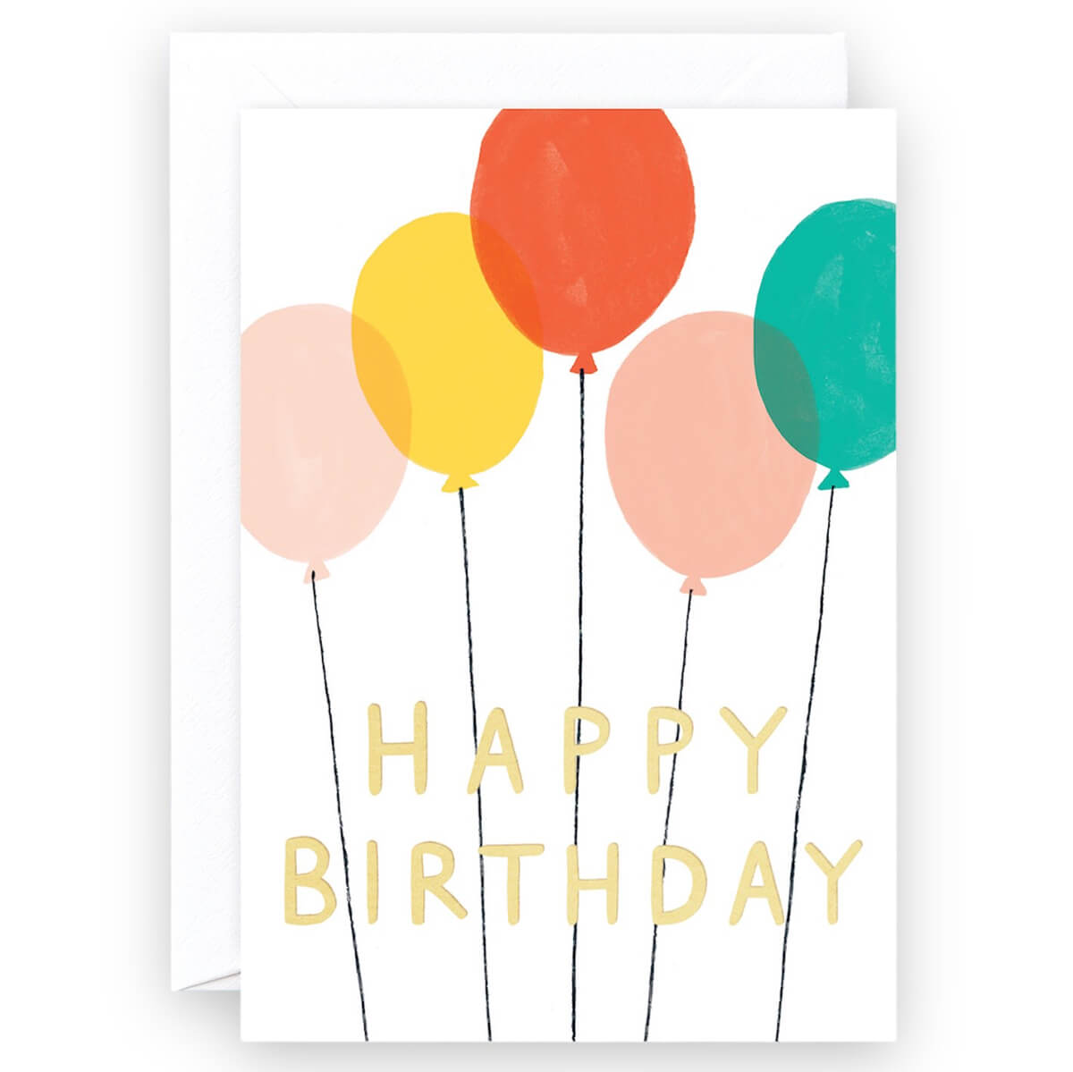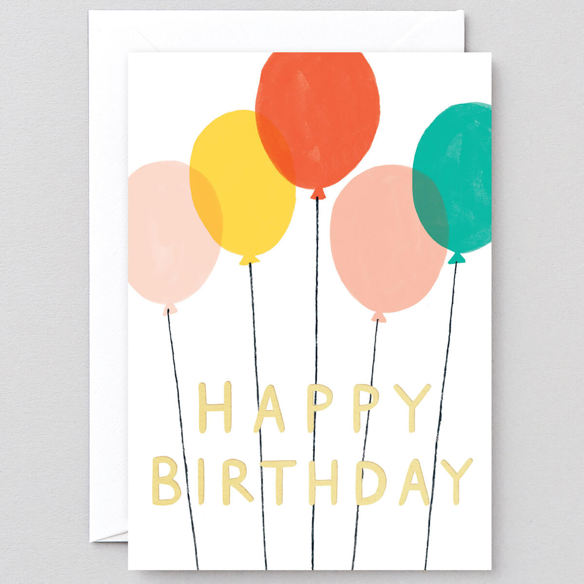 Happy Birthday Balloons greetings card by Charlotte Trounce for Wrap. Features an illustration by Charlotte Trounce, finished with gold foil lettering. Blank inside with white envelope.