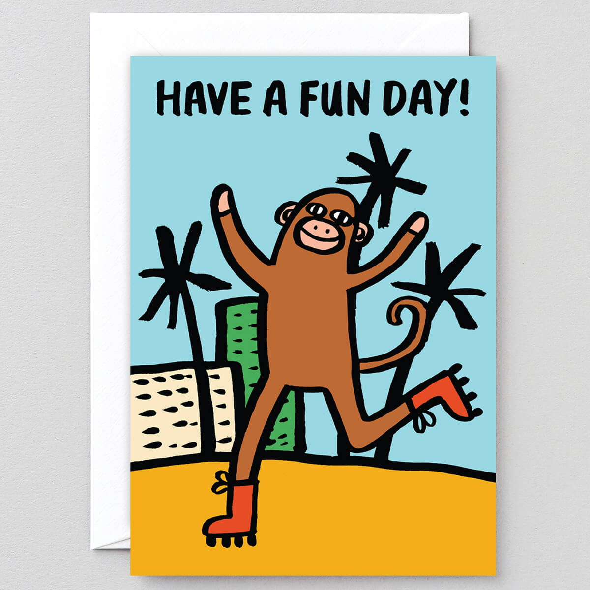 Have A Fun Day greetings card by Alice Bowsher for Wrap. A roller skating monkey having a super fun day illustrated in Alice Bowsher’s signature style using brush and black ink. Blank inside with plain white envelope.