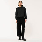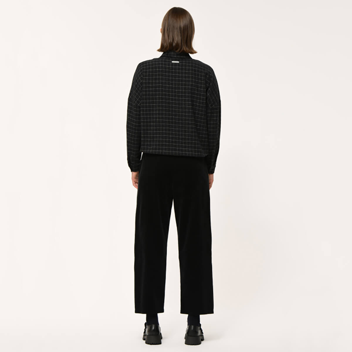 Komori Trousers by Humility. Ribbed velvet 7/8ths trousers, rounded cut with set of cuts, high elasticated waist, slanted side pockets.