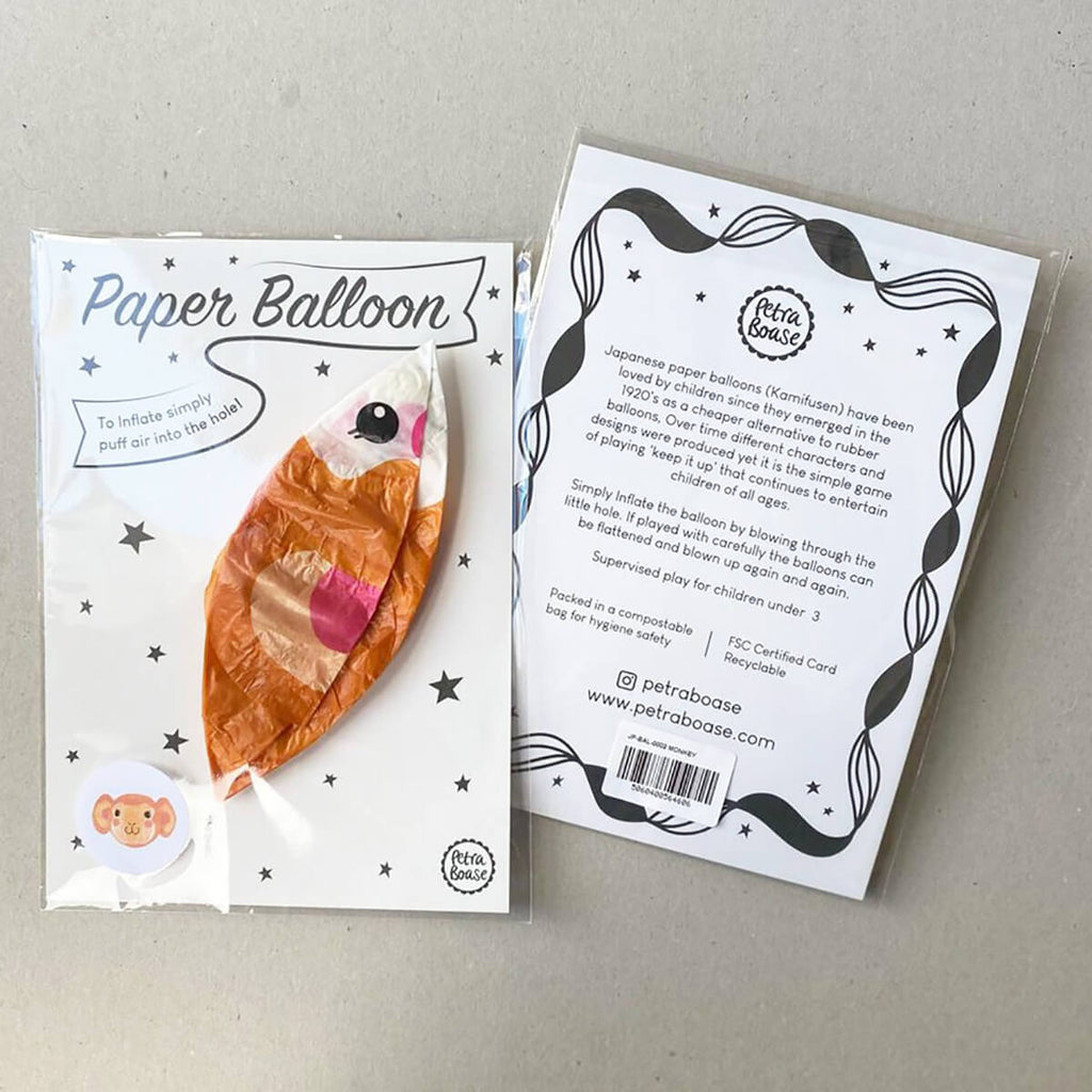 Monkey Japanese paper balloon by Petra Boase.  Each balloon comes flat, to use simply blow in the hole which will force the balloon to expand, inflate and form into its circular shape character.  The balloons can be flattened and blown up over and over again.