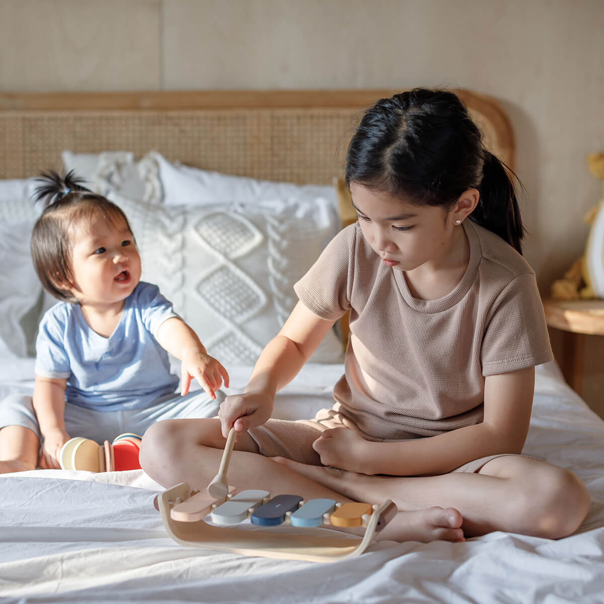 Oval xylophone in new Orchard Collection colours by PlanToys. This wooden xylophone features five colourful panels that provide lots of fun and help with hand-eye coordination. Please note this xylophone is made for fun and may not be musically accurate.