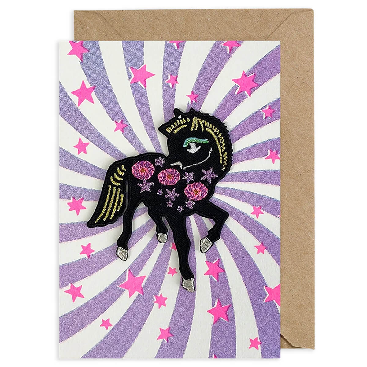 Pony iron on patch greetings card by Petra Boase.  Risograph printed card featuring a richly embroidered colourful patch.  The patch has an iron-on backing so can be removed from the card and ironed on to a favourite t-shirt, rucksack or whatever you like! Blank inside for your own message.
