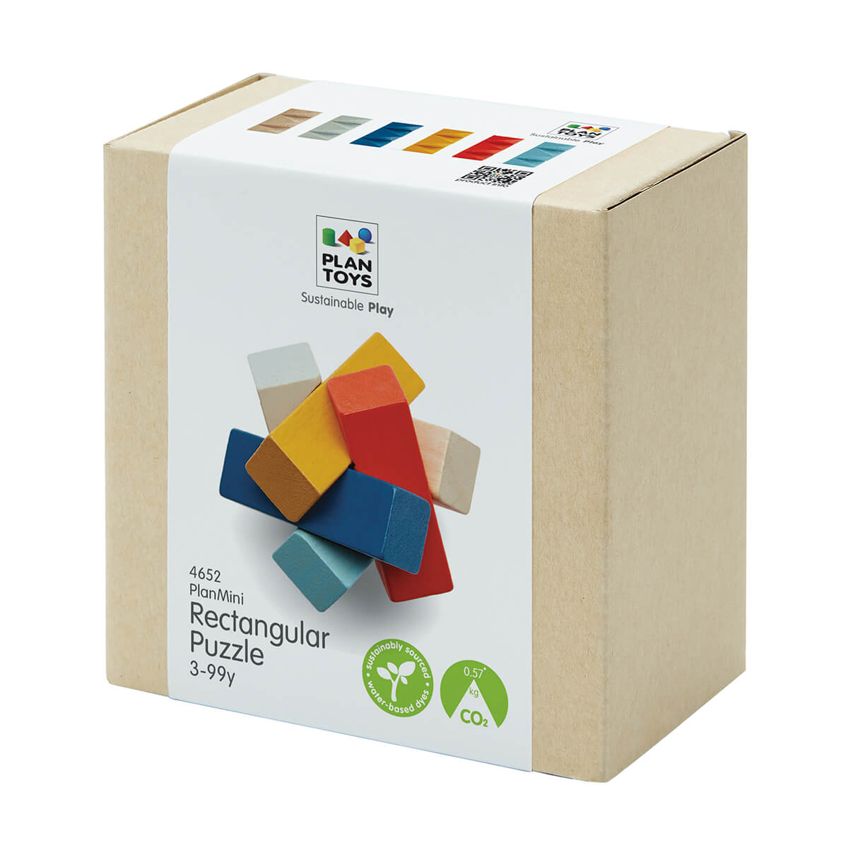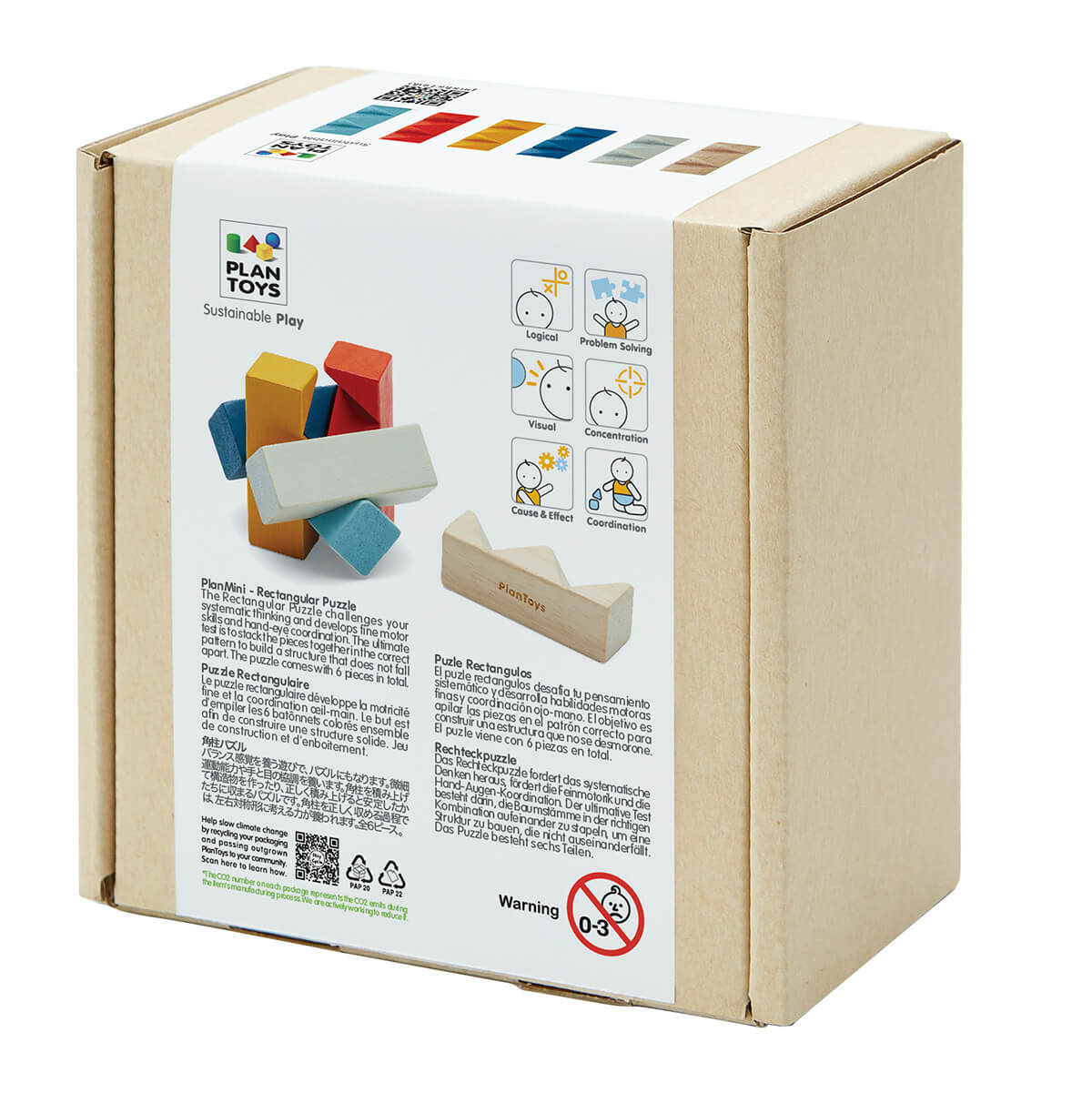 Rectangular Puzzle by PlanToys. The PlanToys Rectangular Puzzle challenges your balance as you solve the puzzle. Through play, children will develop fine motor kills and hand eye coordination. You can play the Rectangular Puzzle in a number of ways. You can stack the pieces in various ways to create pattern and shapes. The ultimate test is to be able to stack the pieces together in the correct pattern to build that sturcture that does not fall apart. It will chanllenge you to think systematically and your hand eye coordination to get the pieces in place at the same time.