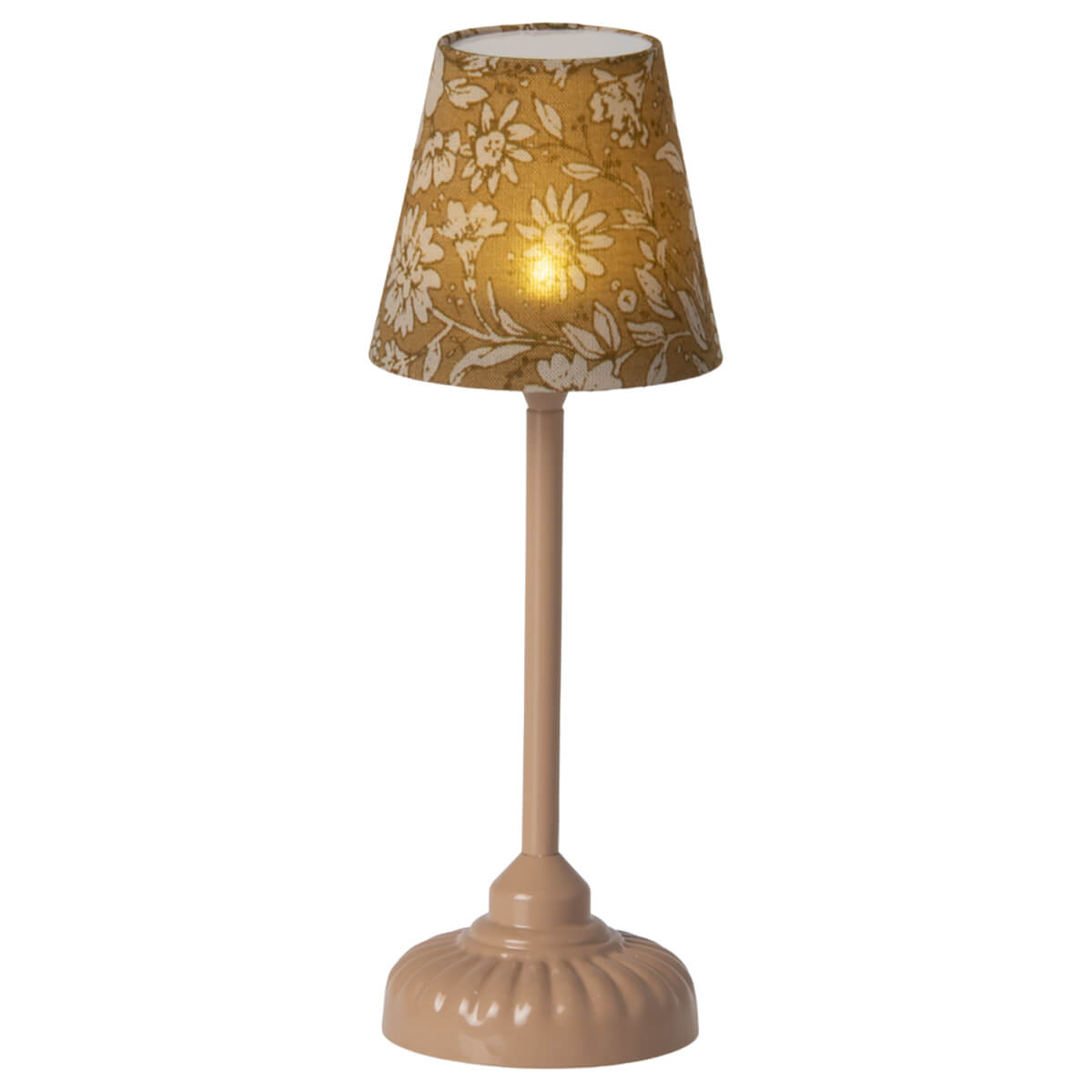 Small vintage floor lamp in dark powder by Maileg.  The beautiful Maileg vintage floor lamp is a must-have. The lamp will light up the room with a soft tone - remember to turn off the light when our friends go to bed. The product comes without battery. You can add a coin cell battery (CR1632).