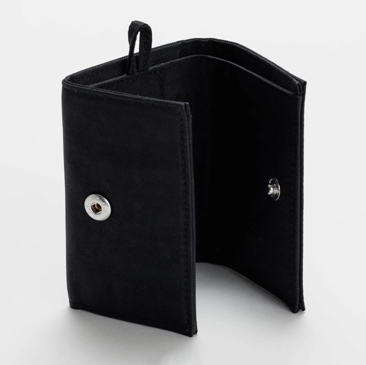 Snap wallet by Baggu. A classic trifold wallet made from recycled heavyweight nylon with a metal snap closure.Features four card slots and one bill compartment. Exterior keychain loop.