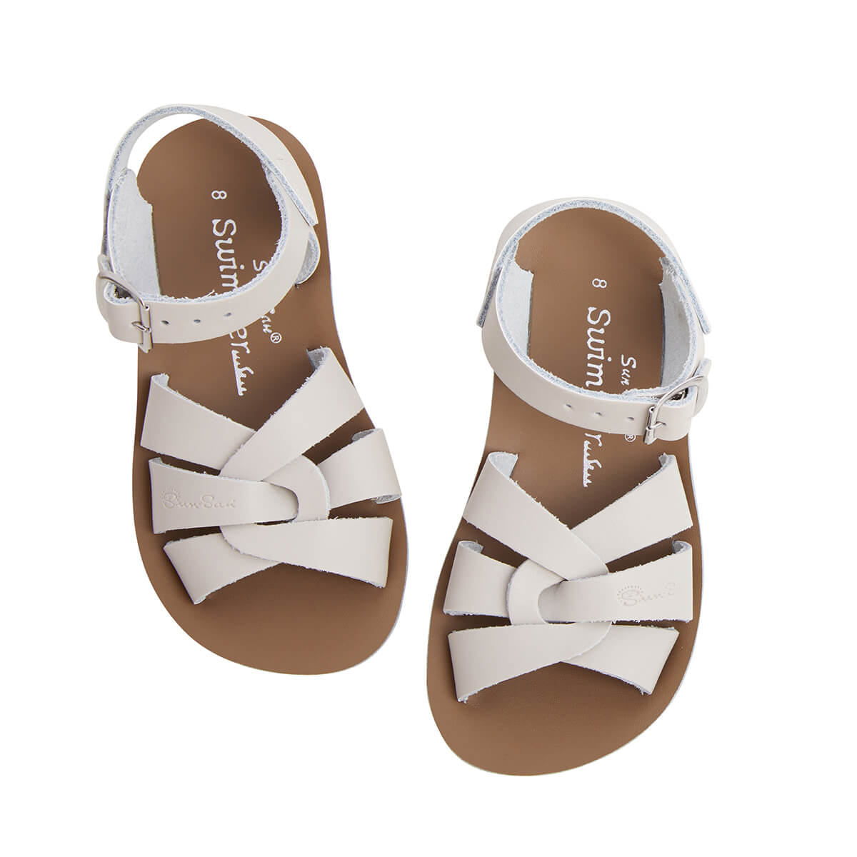 Swimmer sandals by Salt-Water. The Swimmer design is based on the original Salt-Water featuring a plaited leather upper with buckle ankle strap. The differences are the Swimmer has a slightly narrower fitting and, like all Sun-San Sandals, the Swimmer comes on a spongy urethane sole with rust proof buckles. They can be worn in the water and can be hand washed with a gentle detergent.