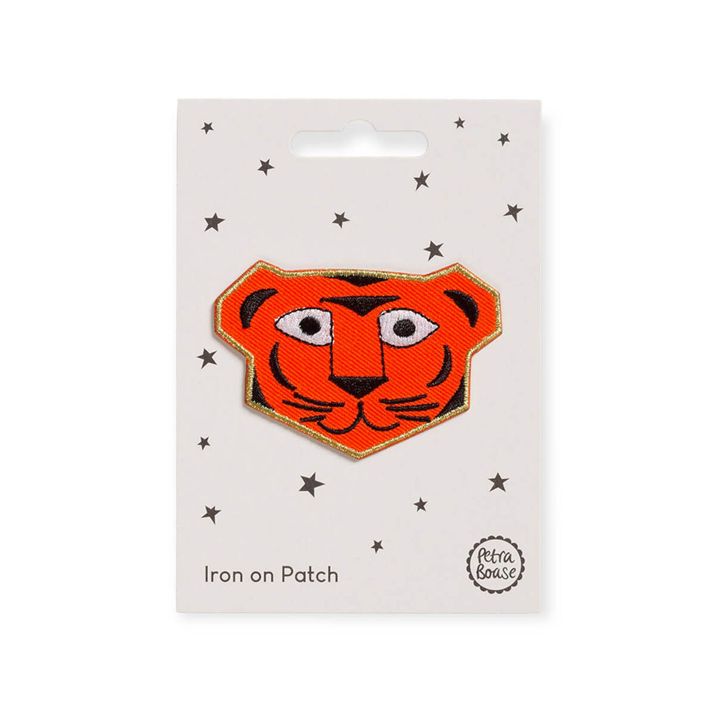 Tiger iron on patch by Petra Boase.  Richly embroidered colourful patch, with an iron-on backing so can be removed from the card and ironed on to a favourite t-shirt, rucksack or whatever you like! The patch is a bright orange, with black and gold embroidered detailing.