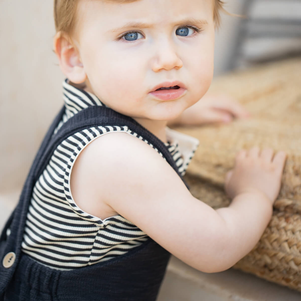 Arnaldo Overall by 1+ in the Family. Sweet baby overall in a textured fleece fabric. With wooden button fastenings.