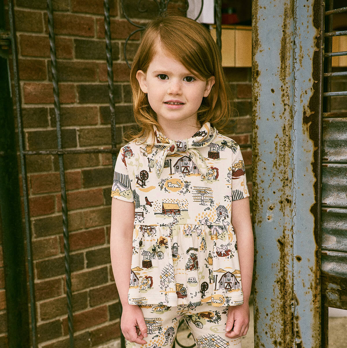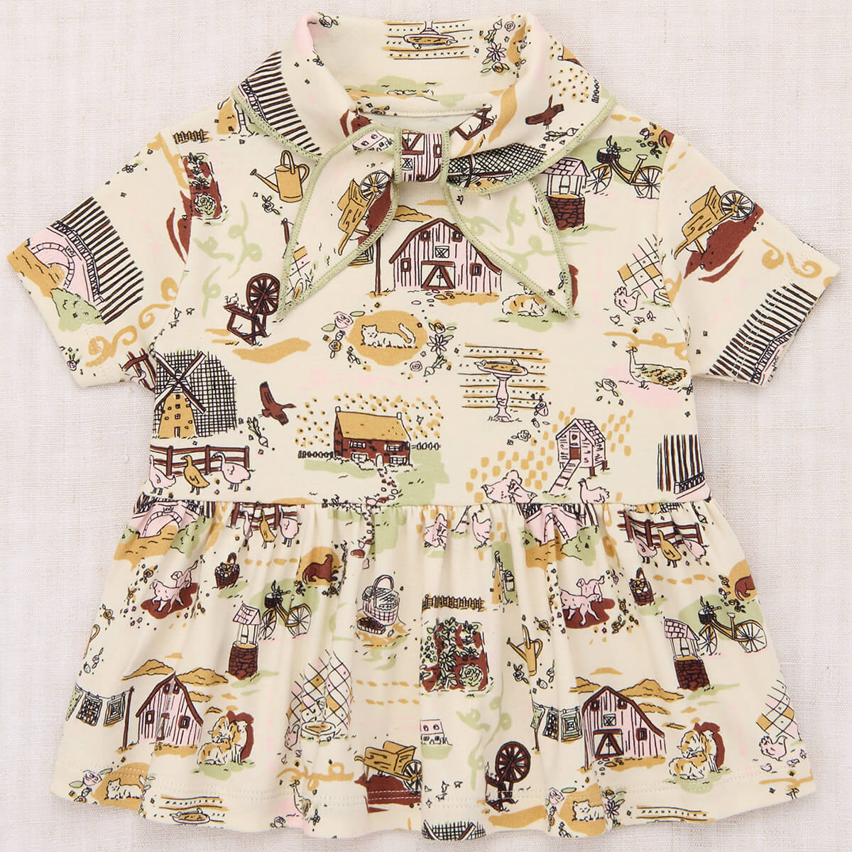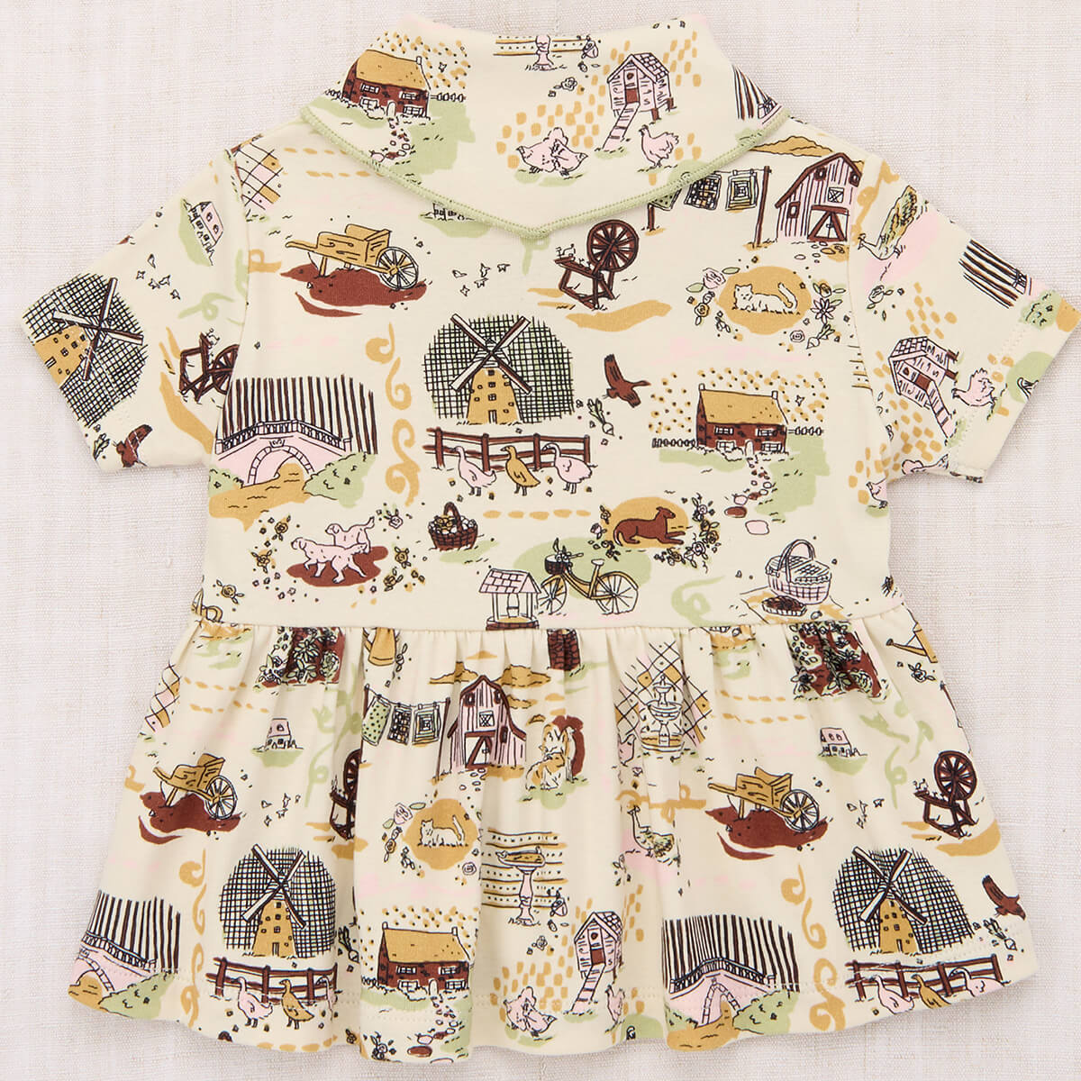 Scout Peplum Top by Misha & Puff. Inspired by Misha & Puff’s signature Scout Top, the Scout Peplum Top is a peplum top in Pima cotton, with short sleeves and the Scout pull-through kerchief with additional soft pointed collar with a contrast merrowed edge. The print originates from a hand-painted design, with storybook scenes carefully translated into fabric.