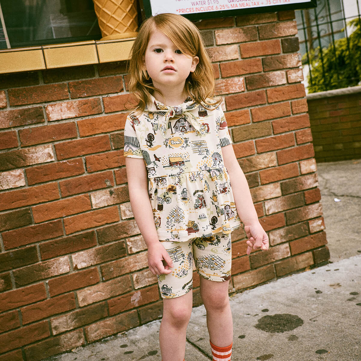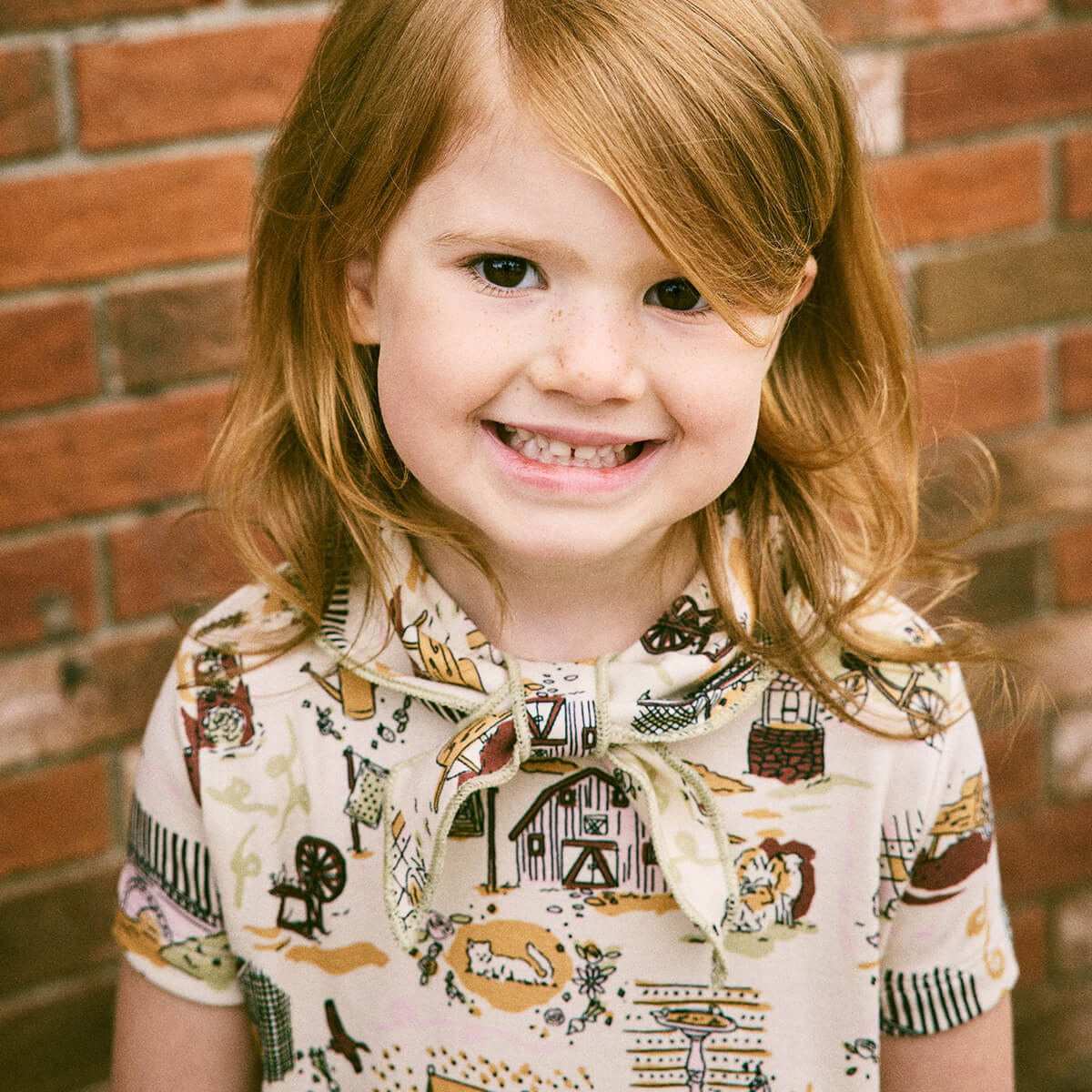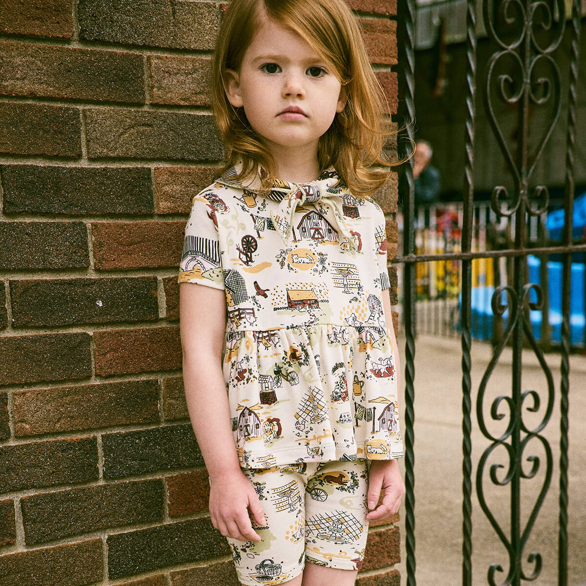 Scout Peplum Top by Misha & Puff. Inspired by Misha & Puff’s signature Scout Top, the Scout Peplum Top is a peplum top in Pima cotton, with short sleeves and the Scout pull-through kerchief with additional soft pointed collar with a contrast merrowed edge. The print originates from a hand-painted design, with storybook scenes carefully translated into fabric.