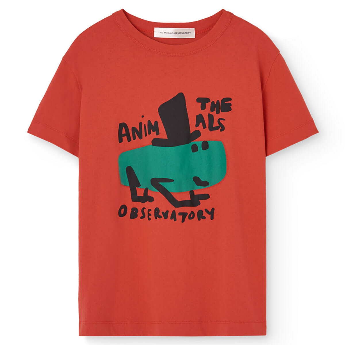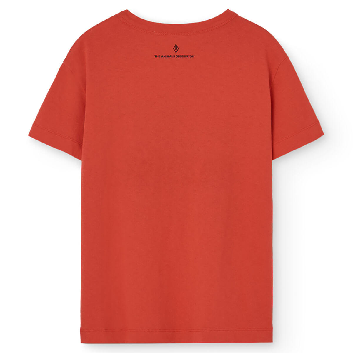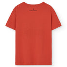 Rooster Kid T-Shirt by The Animals Observatory. This clay red tee displays a quirky grasshopper illustration and handwritten lettering, with a simple logo on the back, offering cool kids clothing that stands out effortlessly.