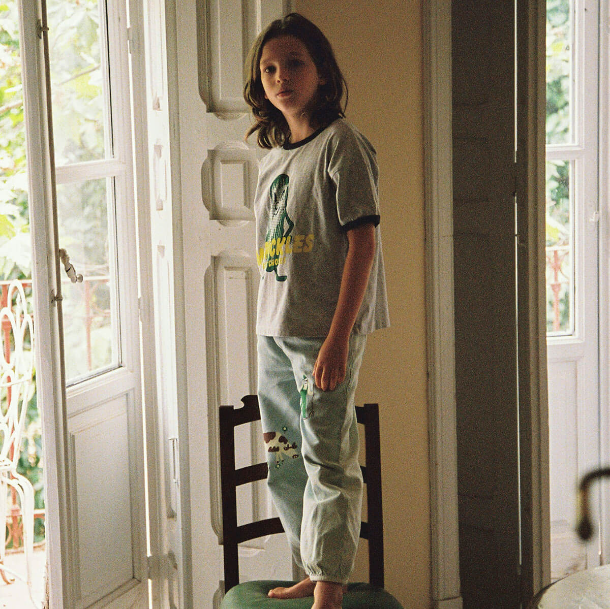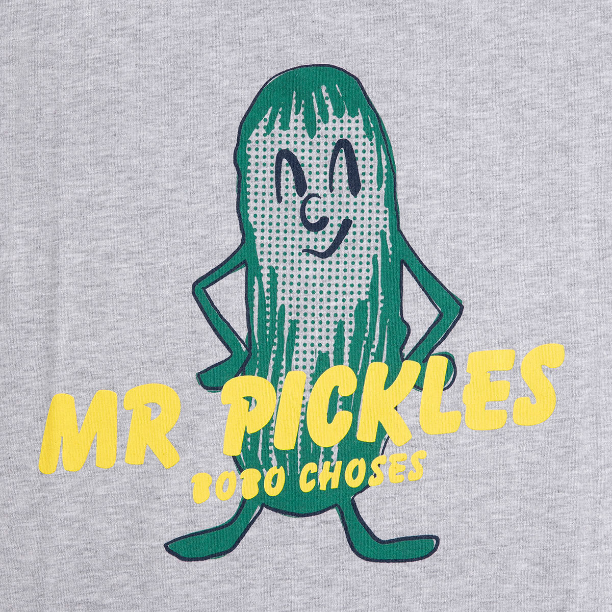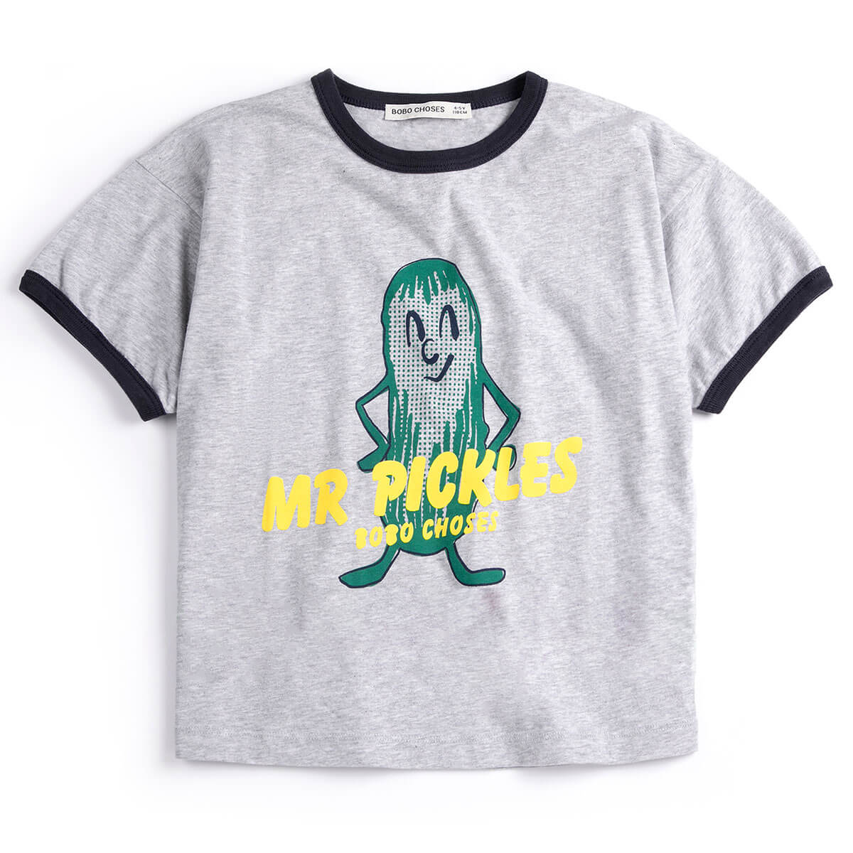 Mr Pickles T-Shirt by Bobo Choses. Heather grey tee with a loose-fit, short sleeves, a round neck and contrast neckline and sleeve binding in navy.