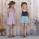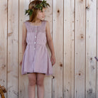 Botanical Crochet Dress by Iver & Isla. The perfect summer dress, this lilac cotton sleeveless dress has a crochet panel, elasticated waist and button up front.