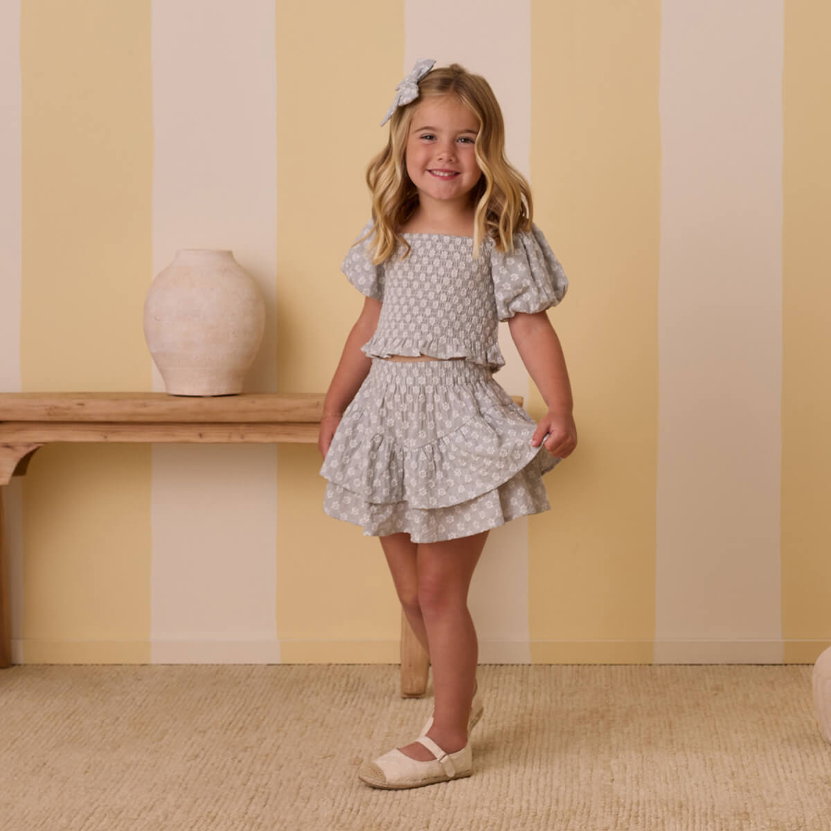 Tiered Mini Skirt by Rylee & Cru. This sweet silhouette comes with two scallop-edged tiers, a v-shape seam, and an elastic waistband.