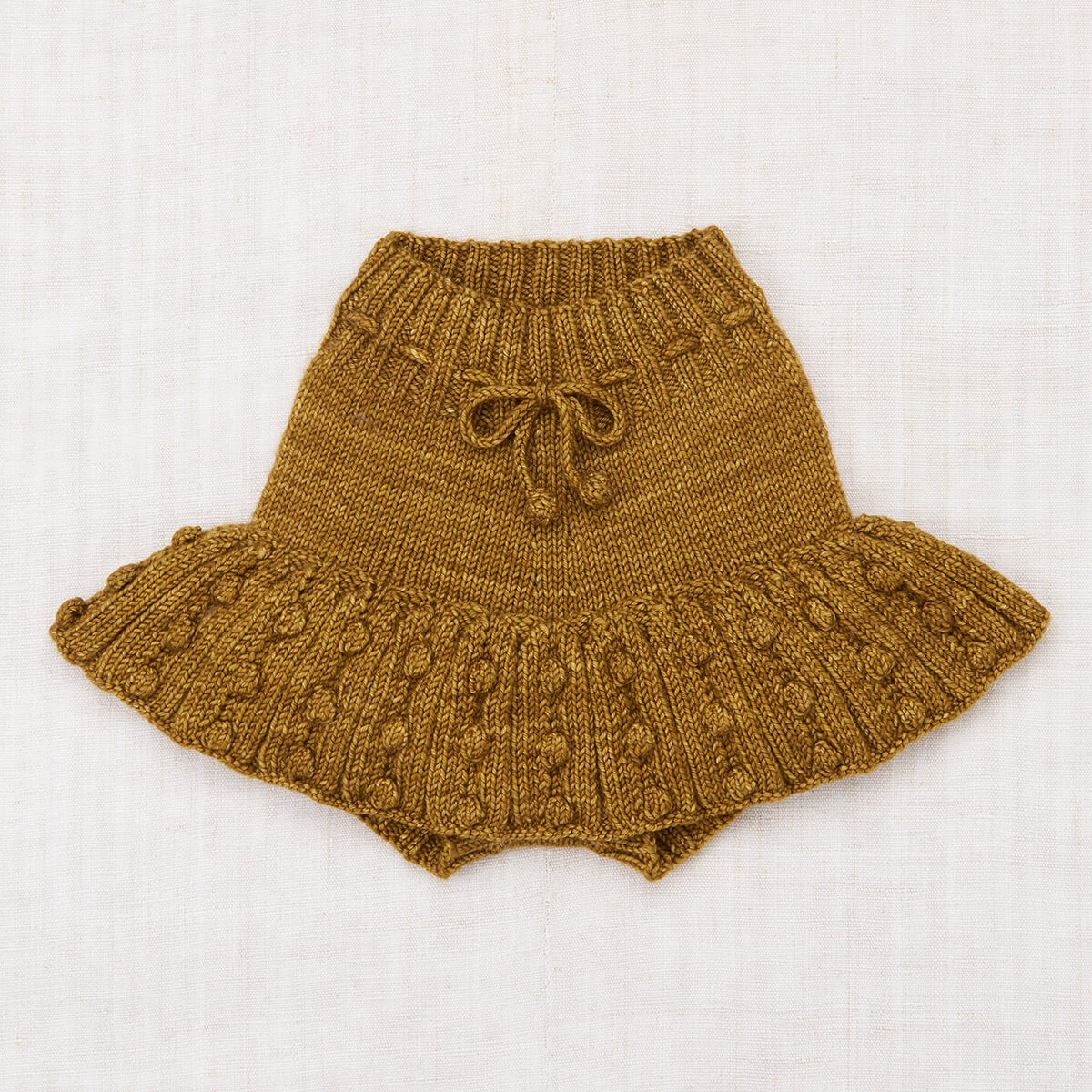 Eyelet Popcorn Skating Skirt by Misha & Puff. A hand-knit skirt in heavier-weight Merino wool. Featuring attached bloomers with ribbed cuffs, eyelet popcorn stitch details, and a ribbed waistband with a popcorn tie drawstring for a secure fit.